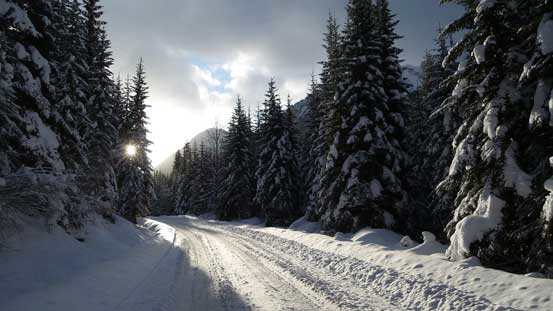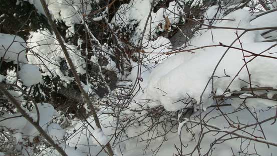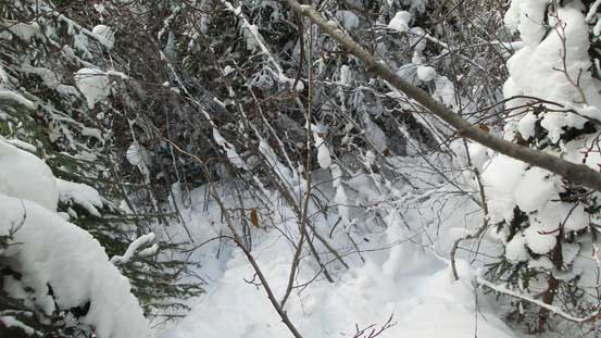 The initial business was walking 6 km up Van Horlick Creek FSR. At time I did not know what exactly to expect but apparently hordes and hordes of 4x4ers and snowmobilers drive up this road way into the valley. That had made my life much easier than anticipated and time flee by fast. In less than 1.5 hours I made to the junction where I was supposed to leave the main road and go up the side road, also known as Pushiki Trail. Snowshoes on and up I went and it turned out that even this side road was heavily travelled by snowmobilers. No complaint on that and at the first major switchback it’s time to leave the packed trail and start the bushwhacking game.