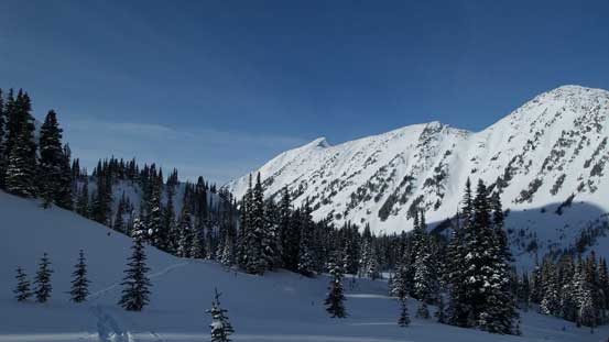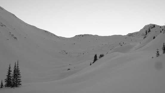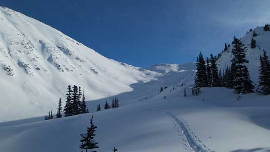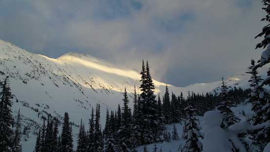 I managed to get going when it’s already bright enough to not require head-lamp. From the last trees my initial business was side-hilling and dropping into the valley which would eventually lead me up to Windfall/Silent Hub NW3 col. It looked like a fair amount of elevation loss was involved but actually not much at all. Plodding up the valley was straightforward and the trail-breaking condition finally improved probably because I’d now merged into the alpine zone. Ascending to the col was easy with nothing too overly steep, and then turning left up the south slopes of Windfall Peak the terrain had become primarily shallow and wind-blown. The snowshoes were ditched soon and a long and foreshortened boot-packing slog would soon begin.