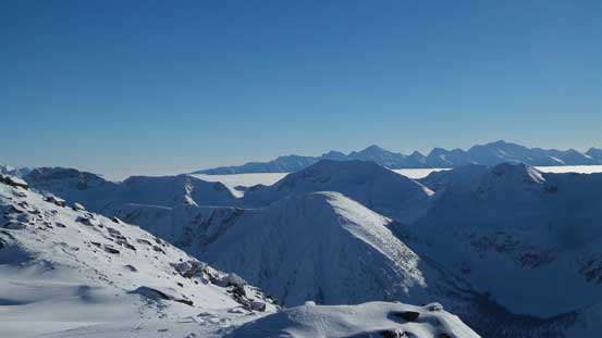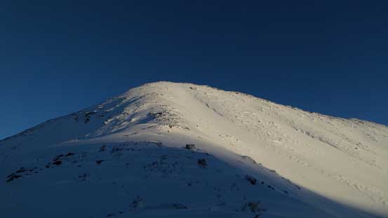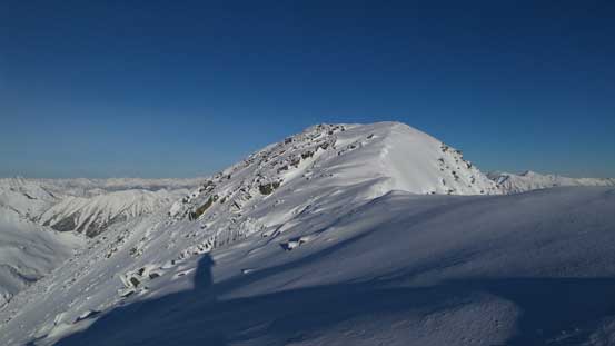 There’s not much to document about the plod up Windfall Peak’s broad south ridge other than perseverance and patience. It looked like very close but actually very far away. Once hitting the summit ridge I turned right first to check out a minor bump before turning my attention for the true summit. The final traverse involved a narrow spot with some massive cornices to be careful about, but nothing overly tricky. To my surprise the summit was actually not very windy so I spent about half an hour up there soaking in the views.