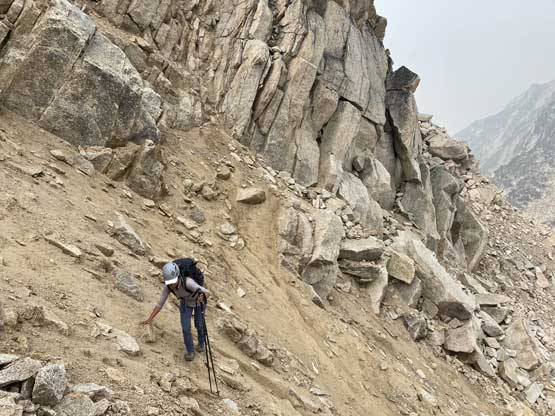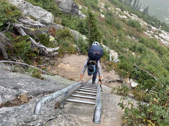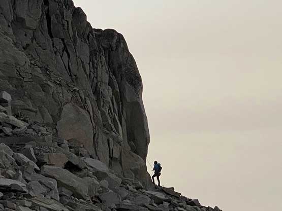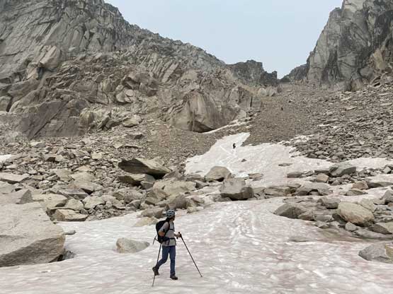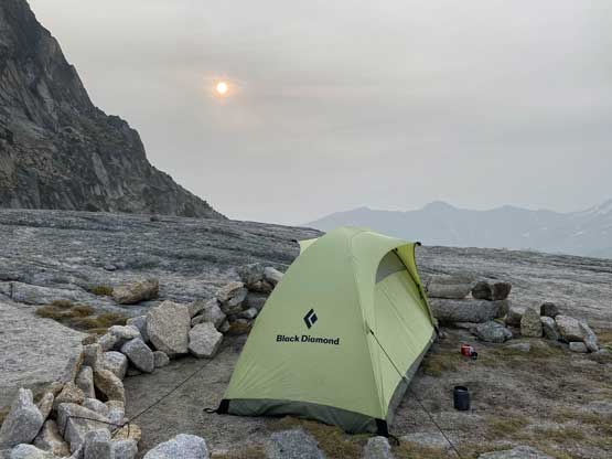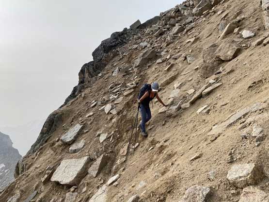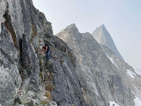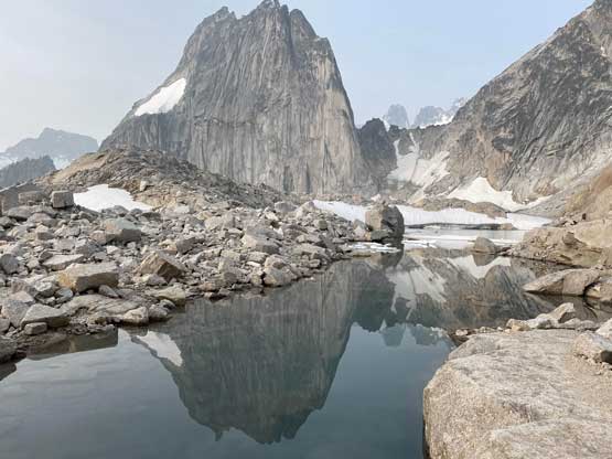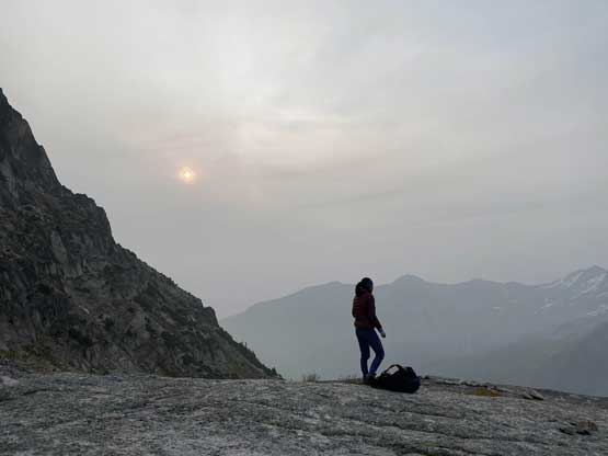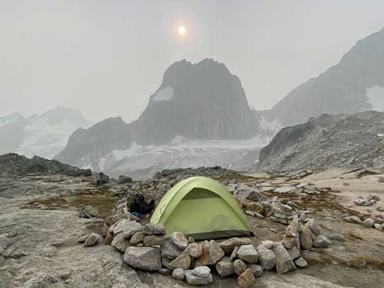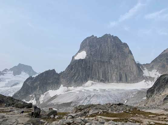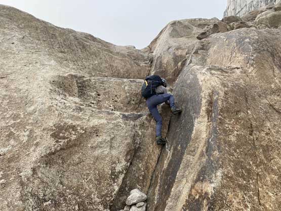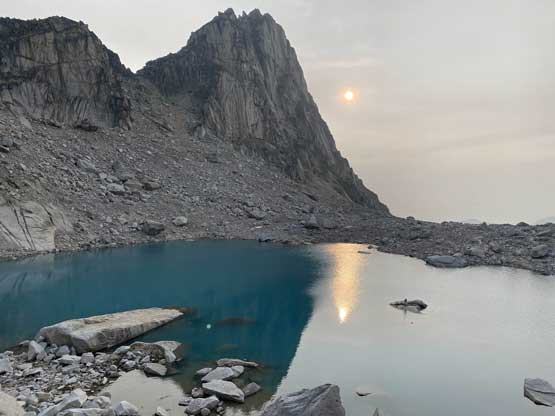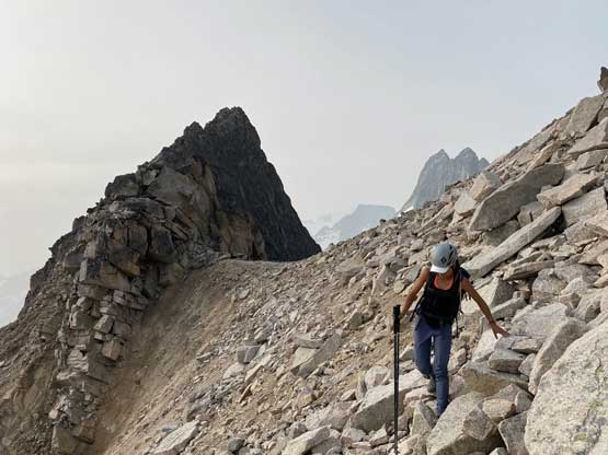 We again, had a lazy morning making Winnie’s coffee and my spicy ramen and didn’t start our day until probably 9 am. The first stage of this ascent was to slog up to Crescent Towers/Spire col. The lakes and tarns were still beautiful but the views were heavily obscured by the thick smoke. We had seen this stage of the hike in the previous day so didn’t take as many photos. We stopped at the outflow of the glacial lake under Crescent Glacier for drinking water, and had a little bit of struggling to scramble up the 4th class step immediately above the outflow. This was my third time scrambling up this step and every time I felt it a little awkward. Then we easily traversed the base of Crescent Towers and slogged the loose gully up to the col. This stage was overall easier and shorter than expected.