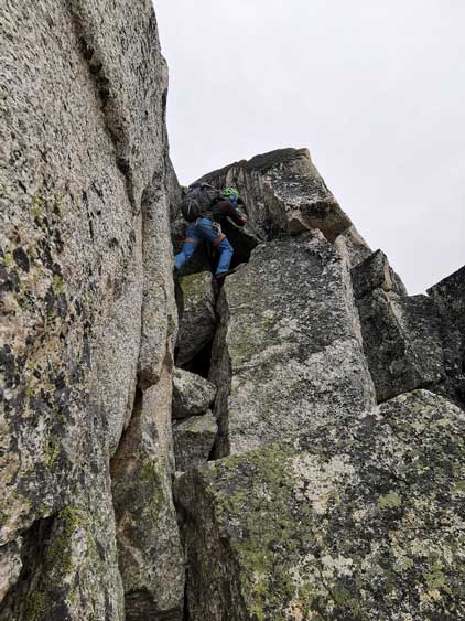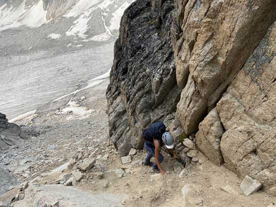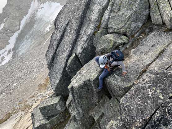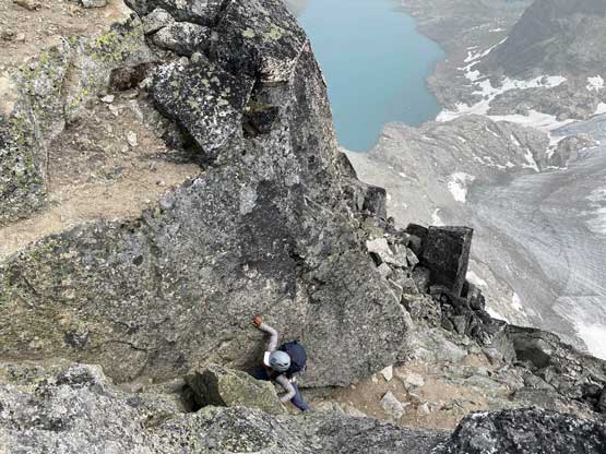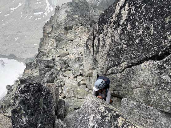 The next stage was a short traverse/descent of Crescent Spire’s east face on choss. I was expecting permanent snow patches and/or complicated route-finding but it turned out to be quite easy. We did have to deal with some compact choss but the scrambling had never exceeded “moderate”, or “class 3-“. This short descending traverse brought us to the broad NE Ridge of Crescent Spire. We then followed the climber’s path descending the north side and around a buttress and then onto the more exposed section of the NE Ridge of Crescent Spire. We followed the knife-edge to a dead-end, and without an existing rappel station we knew this was not good. We backtracked for about 20 meters and found a possible line to down-climb onto a ledge system on the north side. In retrospect we should have backtracked farther but the line we took still worked (awkward 4th class on questionable rocks). Traversing that ledge was very exposed, but not difficult and the next thing we were at the 5th class crux down-climb. This short down-climb looked more like what we had been reading so we set up a station (sling around a pitch point) and went for a short rappel. After that we still had to traverse and down-climb some sketchy 3rd to 4th class terrain before reaching Crescent/Brenta col.