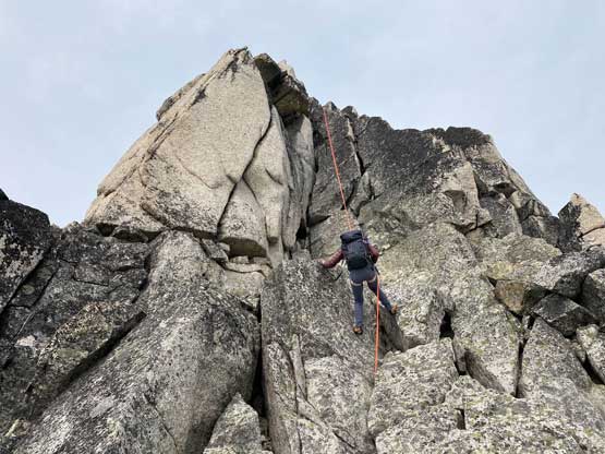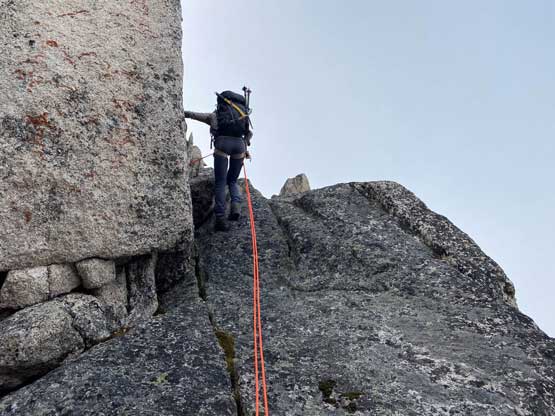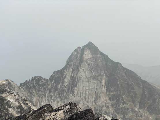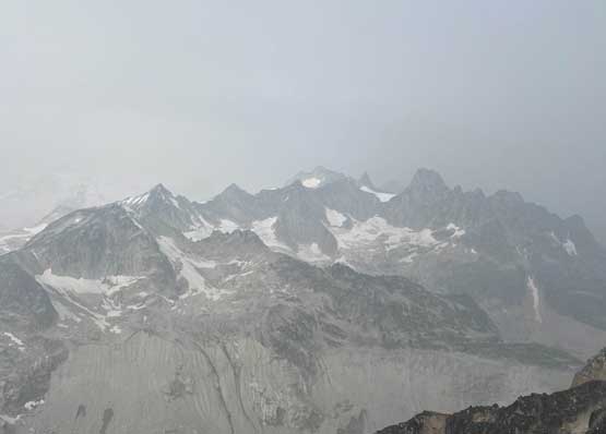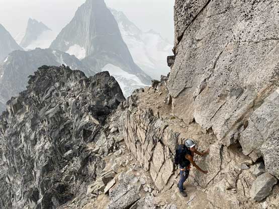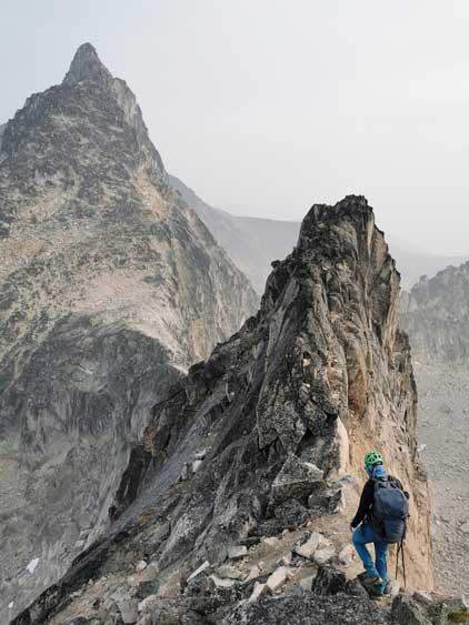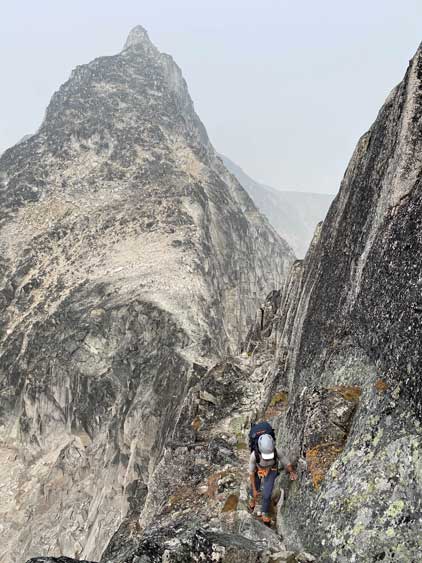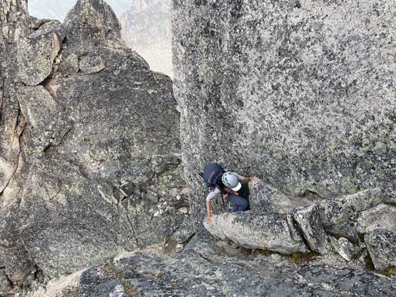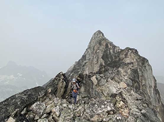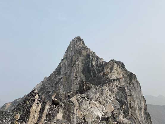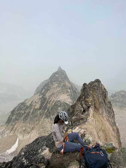 We ditched snow gears at the col as it’s apparent that they weren’t needed on this particular day. The lower portion of Brenta Spire’s south ridge was a tedious plod on talus and boulders which none of us enjoyed, especially in this thickening smoke. Eventually we came to the false summit and the ridge narrowed down. We took a very long break near the false summit before going for the summit push. There was at least one awkward step before the final “5th class chimney”. I’d seen various grades from 4th class to 5.6 and I was expecting it to be difficult, but we ended up just scrambling and soloing all the way to the summit. The hardest part of that chimney was to mentally trust a few blocks to grab onto. The rock on this peak is granite, but never felt solid enough to put all our fate on.