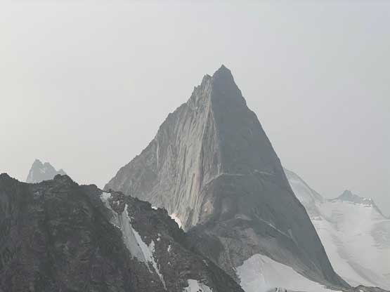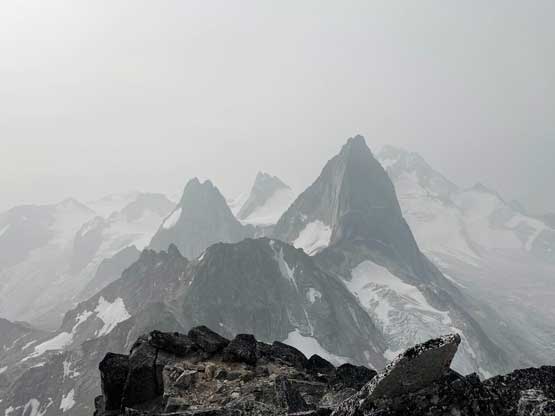 Earlier in this mini road-trip we climbed Uto Peak in Rogers Pass before moving to the Bugaboos. In our first day in the “Bugs” we carried overnight gears to Applebee Dome camp and made an ascent of Lions Way on Central Crescent Tower. This was meant to be a warm-up climb but turned out to be much harder than Brenta Spire itself. In the morning of our second day we woke up with a thick layer of smoke but such wouldn’t bother us from carrying on.