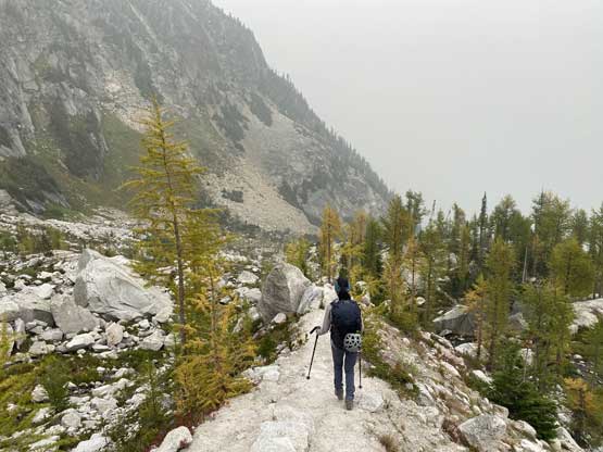To re-ascend the NE Ridge of Crescent Spire we more or less followed our own route. We both soloed that short 5th class step because we were too lazy to take the rope out again. I didn’t even bother to swap my footwear back to rock shoes and I had to say that to climb that step in mountaineering boots was a tad challenging and awkward. We made better route-finding decisions on the ledges above that technical step that we didn’t encounter any sketchy spot on the return. That traverse from NE Ridge of Crescent Spire to Crescent Spire/Towers col was not very pleasant, but not difficult. The descent of the loose gully on the opposite side of the col was also not very fun. We took our time packing up the gears at camp, but once committing to the return hike we settled for a relatively fast pace.