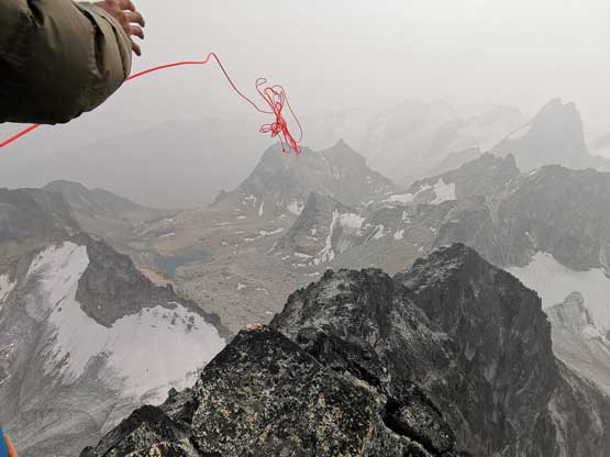 The view from the summit was not very good thank to the smoke so we didn’t linger too long. None of us was keen to down-climb the chimney so we were looking to rappel. I was surprised to find no existing rappel stations but thankfully we had brought enough cords. We found a bomber boulder on the south side and did one easy rappel to get off technical terrain, followed by a somewhat tedious descent to Crescent/Brenta col.