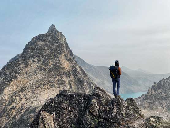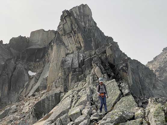 We again, had a lazy morning making Winnie’s coffee and my spicy ramen and didn’t start our day until probably 9 am. The first stage of this ascent was to slog up to Crescent Towers/Spire col. The lakes and tarns were still beautiful but the views were heavily obscured by the thick smoke. We had seen this stage of the hike in the previous day so didn’t take as many photos. We stopped at the outflow of the glacial lake under Crescent Glacier for drinking water, and had a little bit of struggling to scramble up the 4th class step immediately above the outflow. This was my third time scrambling up this step and every time I felt it a little awkward. Then we easily traversed the base of Crescent Towers and slogged the loose gully up to the col. This stage was overall easier and shorter than expected.