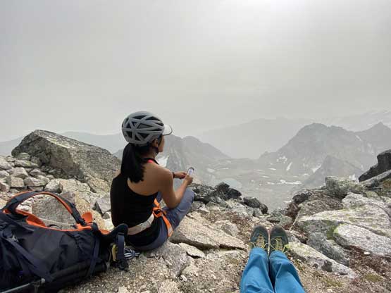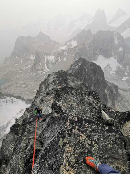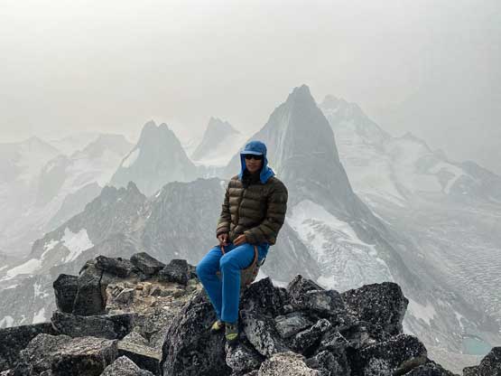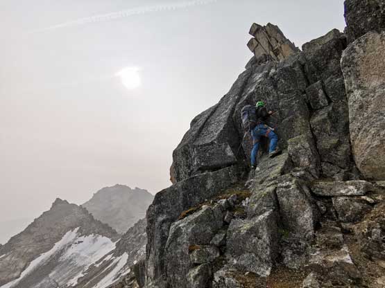 We ditched snow gears at the col as it’s apparent that they weren’t needed on this particular day. The lower portion of Brenta Spire’s south ridge was a tedious plod on talus and boulders which none of us enjoyed, especially in this thickening smoke. Eventually we came to the false summit and the ridge narrowed down. We took a very long break near the false summit before going for the summit push. There was at least one awkward step before the final “5th class chimney”. I’d seen various grades from 4th class to 5.6 and I was expecting it to be difficult, but we ended up just scrambling and soloing all the way to the summit. The hardest part of that chimney was to mentally trust a few blocks to grab onto. The rock on this peak is granite, but never felt solid enough to put all our fate on.