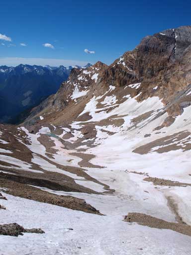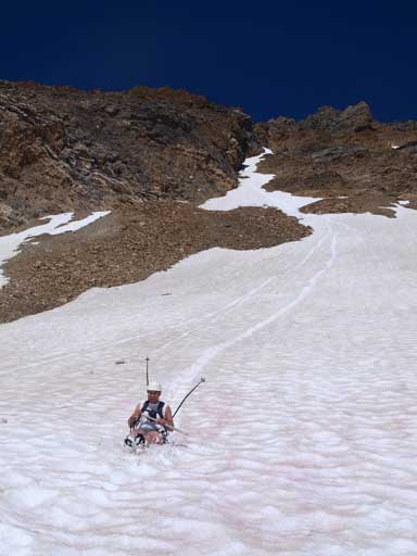After staying more than 1 hour on the top, we finally decided to descent. We took the easier line to descend the summit block, and then kept skier’s right and found a long scree run that brought us back to the middle section. We down-climbed what we came up, and then stayed on skier’s left of the snow gully. About halfway down we merged to snow and got some steep glissading. It was so steep that we had to slide while facing inwards and self-arresting. A bit awkward but that’s still faster than descending the rock. Lower down we finally could enjoy a long slide back to the upper Nelson basin. Our hands were cold and we took a long break there.