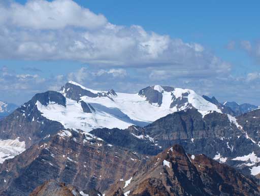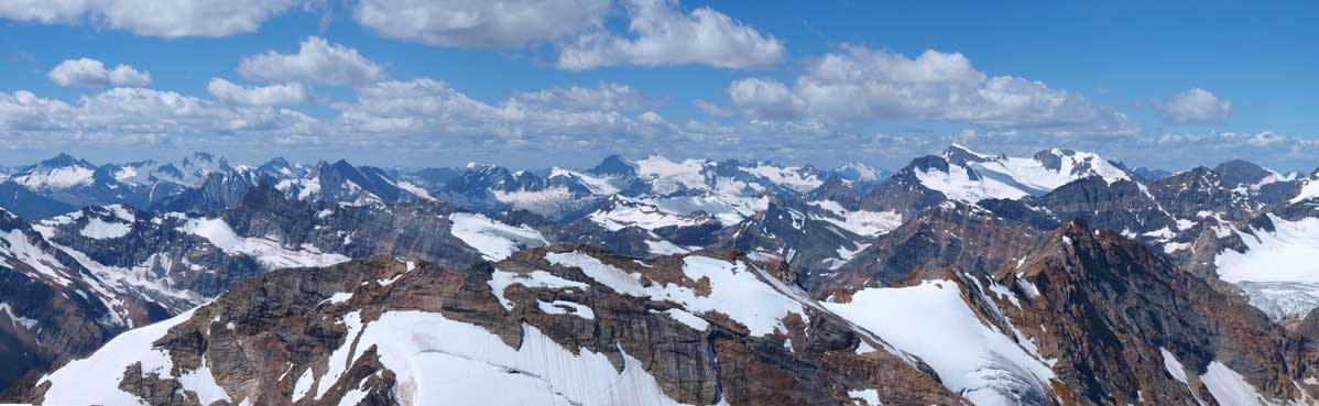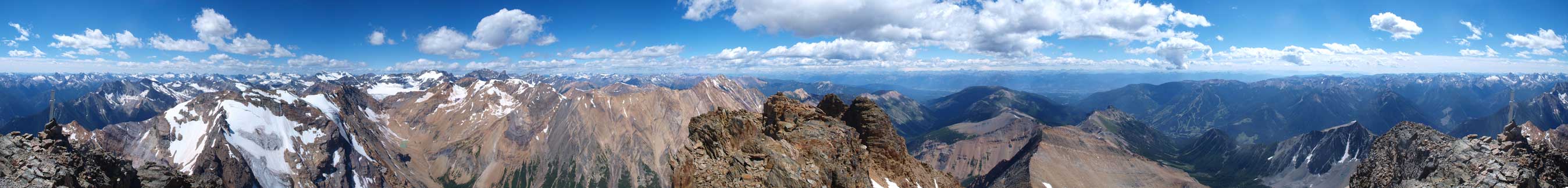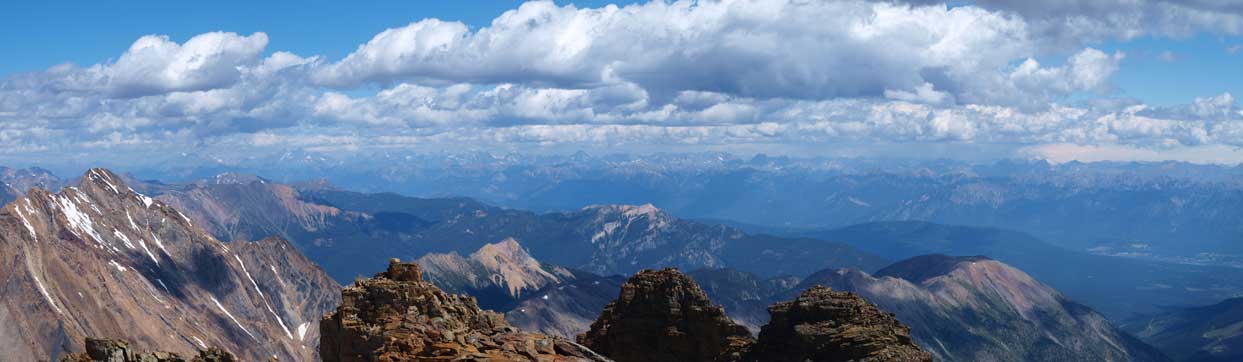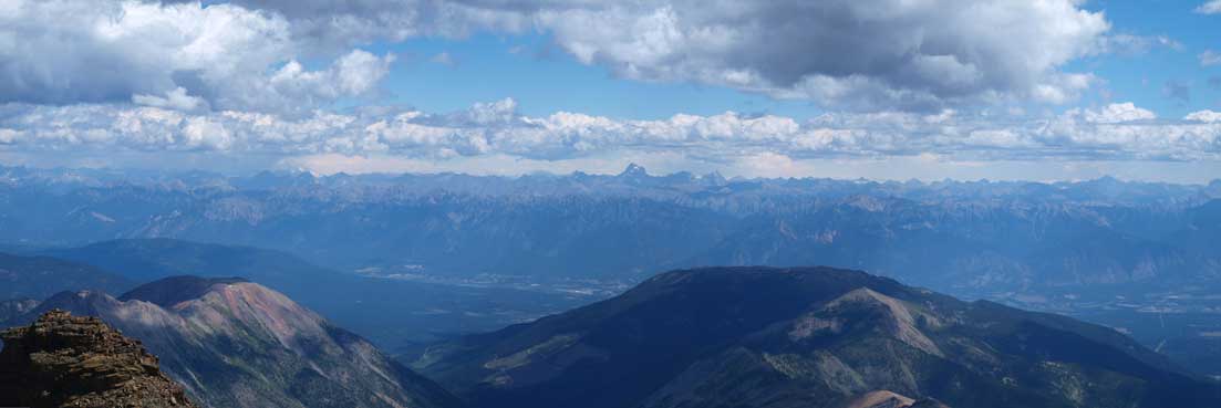 After clearing this crux section we went straight up. The terrain got confusing here since we couldn’t figure out where to go. The described route goes up climber’s left but is looser than the one we took. Our route is still easy to moderate scrambling but with less scree slog. Once we got higher enough we could finally see the summit block on our left side. By now we finally got higher than Sultana Peak, thus magnificent views started to show up, with many visible Purcell 11,000ers including Jumbo, Delphine, and Farnham. On the summit block we took a difficult line but there exists a much easier line to our climber’s left that we’d discovered on the way back. And minutes away we were standing on this lofty summit identifying hundreds of mountains.