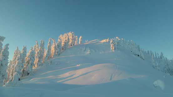It was very cold when lingering around so we quickly resumed the ascent. There were a few more slopes to ascend but soon enough, the angle tapered off and we arrived at the first summit. The true summit was on the far end and getting there involved one short stretch of traverse on a corniced ridge. The views were magnificent but unfortunately my camera froze up in that cold wind after snapping a few shots.