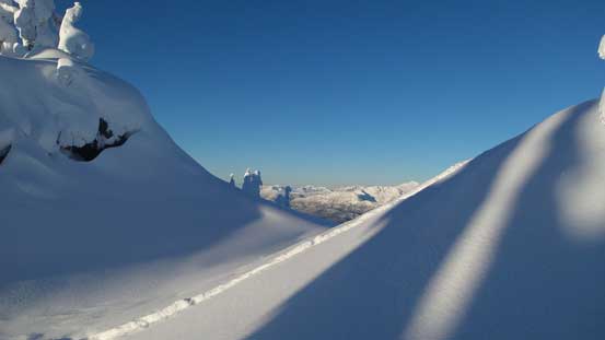 The major sets of tracks branched near a clear-cut. We took the right side fork which followed another spur road traversing a long ways on the south side of Mt. Mulligan aiming towards the distant Anif/Mulligan col. The last 100 m or so to gain the col was steep and involved a lot of post-holing on the deep, fresh powder.