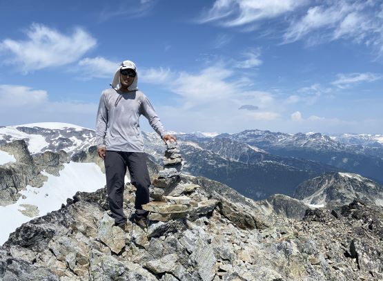 We briefly contemplated about traversing across the entire southwest face of Brandywine Mtn. to intersect the west ridge saddle but decided to just follow the trail on the ridge. This involved and up-and-downs on the ridge, but should be overall faster as plodding on a well-defined path is much simpler. At the base of the summit we traversed across the uppermost SW Face on choss and snow to the uppermost west ridge saddle. Francis opted to wait for me to make a quick dash up the blocky west ridge to the summit. The scramble was longer than I thought and involved some class 2 moves on boulders from this side. I met a group of Squamish locals on the summit, but didn’t linger too long as we had a long day ahead. I quickly made my way back down the west slopes to regroup with Francis.