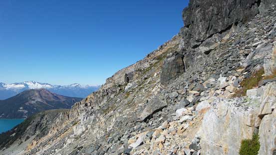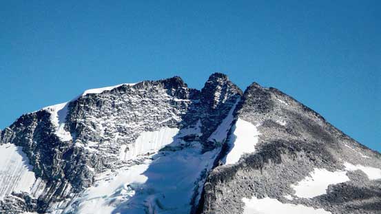 I took a fairly long break as I didn’t want to leave this beautiful place knowing I probably wouldn’t be back here ever again, but I knew I had to get going soon as I still had a LONG way back home to go… I “crab-walked” down to the snow covered ledge, then carefully traversed back across, then “crab-walked” again down to the true/west col with no problem. Back up the ramp there’s that strenuous move. I wasn’t sure if I had picked the best line but the foot placement was very poor on that move so it’s mostly pulling myself up with some pure arming strength… Once I made it through the rest of the way back to the west summit was fairly straightforward. I took another well-deserved break on the west summit before continuing the descent.