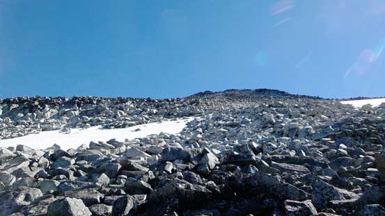 The section ahead was a bit confusing as I didn’t bring route description with me. I circumvented the imposing pinnacle directly ahead on the right side but then went up too early. I ended up on top of that pinnacle looking down at a 10-meter drop. Instead of retracing my steps down I took a further look over the edge and decided to just down-climb into the notch – only one trickier move involved towards the end. After that bit of detour I started to see more cairns and had no further issue getting onto the broad W. Ridge. Ahead would be the last plodding section, the most “exciting” one… It’s hundreds of vertical meters of gigantic granite boulders… It’s brutally tedious but at least most of the boulders were solid but there’s always a few exceptions that could give you a good surprise…