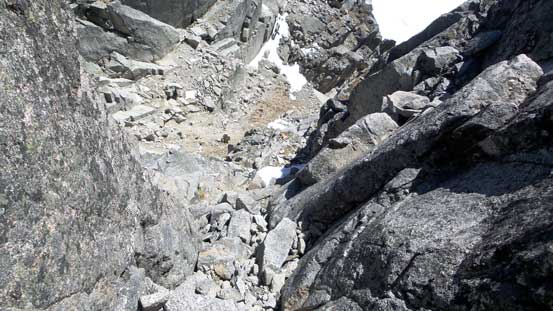 As I slowly ascended to the lower west summit I kept imaging the look across the gap towards the true one as from earlier observation I could see fair a bit of snow on the N. Face ledges. Thankfully it didn’t look too bad once examining up-close. Descending from west summit to the connecting col I followed the ramp/gully option that went downclimber’s right. There’s one tight and very strenuous move involved (but only moderately exposed), but other than that I agreed with the Class 3 rating.