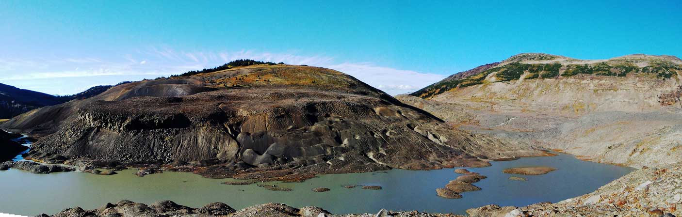 Crampons on and down I went. The ice had become considerably softer and there’s a LOT of surface melt on this glacier. I retraced my line back across, then up and over the minor bump just before Panorama Ridge, and then picked my line down to that mud lake. And then it’s the trail plod…