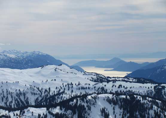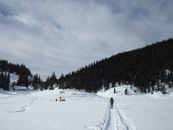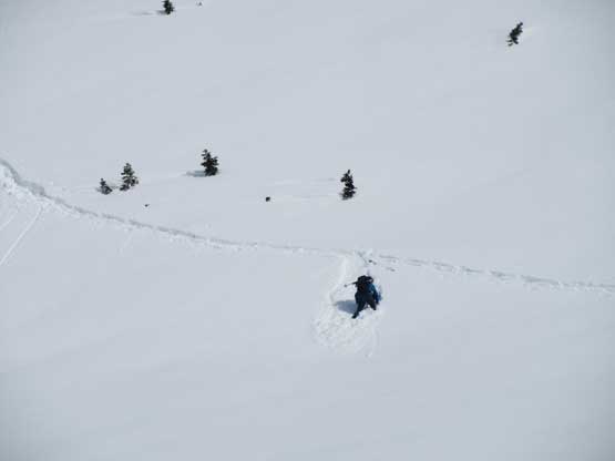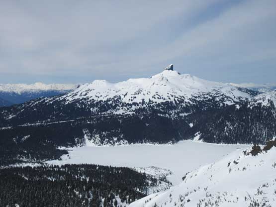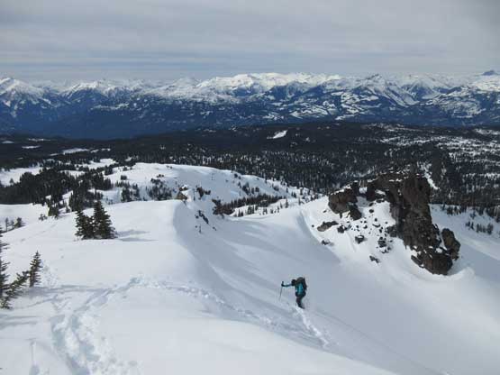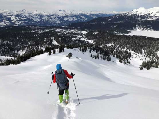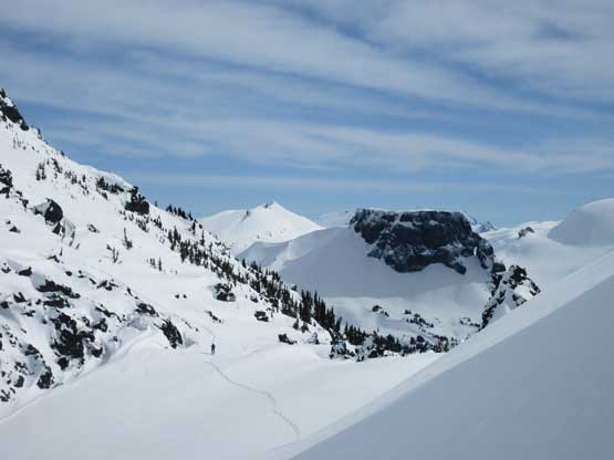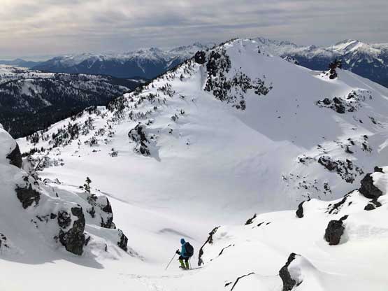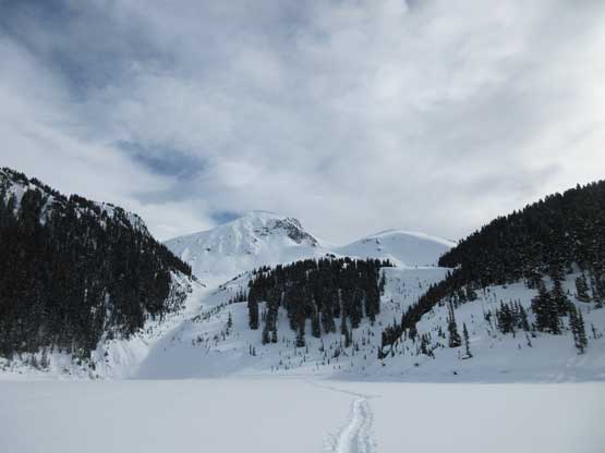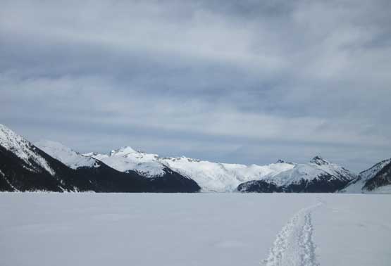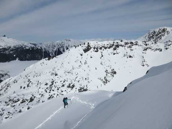 Knowing that Tiger and Milan were far ahead of us on the descent Mel and I didn’t linger any longer than necessary. After consulting with the Gaia GPS map I made the call to descend the NW Ridge all the way to treeline before making a side-hill traverse to rejoin our tracks on Mt. Price. The main reason was to avoid re-ascending that steep and awkward slope to get back onto the unnamed peak. Descending the NW Ridge was not as easy as I thought and we had to make constant route-finding decisions. The traverse to get back onto Mt. Price’s NW ridge involved crossing a long stretch of steep slopes and once there we had to plunge down another steep slope to rejoin the tracks. The rest of the descent to, and across Garibaldi Lake was uneventful. We utilized soft powder for as much as possible.