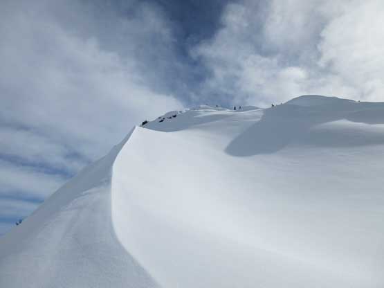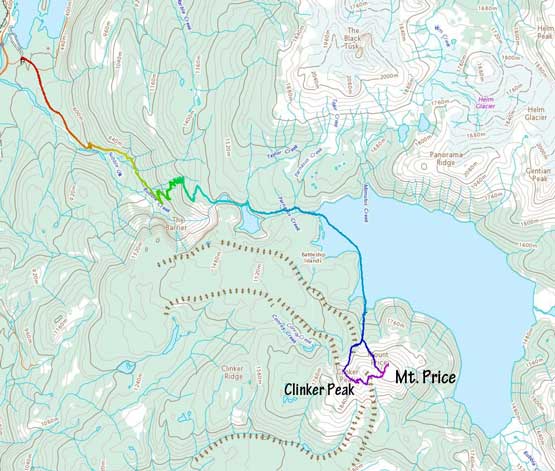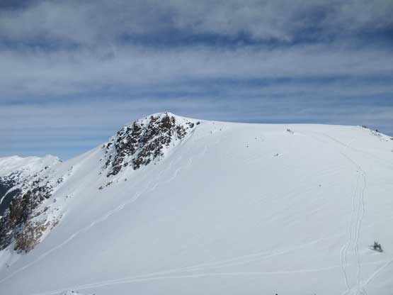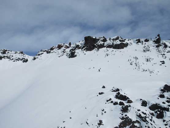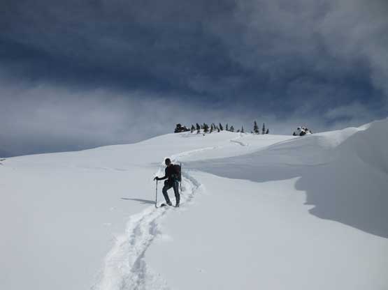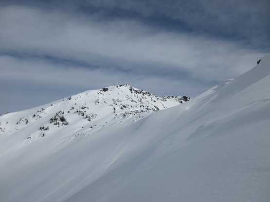 From the bottom of the unnamed/Clinker col there seemed to have several route options. My original plan was to attack the south, wooded ridge but decided against that. The ridge looked no fun at all. After evaluating the situation I decided to cut another long, but not-so-steep traverse to intersect the north ridge of Clinker Peak and this worked out well. The post-holing was reasonable and the route certainly ascends more variable terrain than the south ridge. We had to ascend several steep rolls but soon enough we reached the summit.
