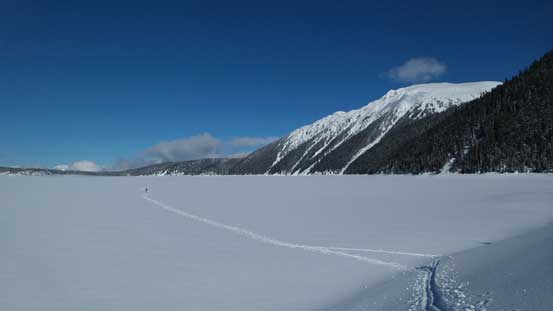From the junction we took the right hand branch which led ~3 km towards Garibaldi Lake. We easily followed the skin tracks down and across Barrier Lake and then it’s time for the mess around Lesser Garibaldi Lake. I had never done this approach before (from the “inward” direction) and here Alex led a line traversing above the lake shore following a faint set of skin tracks. This dumped us much lower than the summer trail and by the time we reached the opposite side of Lesser Garibaldi we came to a dead end. After messing around for a few more minutes we made the call of bailing steeply uphill to intersect the summer trail. Indeed, that’s where the major set of skin tracks went. We had no further issues to reach the entrance of Garibaldi Lake but this trail was quite undulating…
