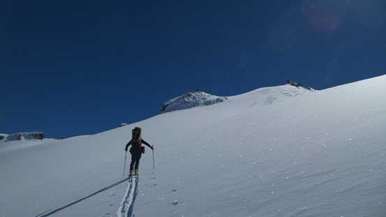 Here Alex led a line staying more to the climber’s right and we then took a rising traverse line to overcome the steep roll at the start. Further up the valley between Deception Peak and Guard Mountain we also stayed high on climber’s right side before eventually taking a traverse line to hit Sphinx Glacier. The plod up this glacier was as straightforward as one would expect, but did feel very, very foreshortening especially given the duty of trail-breaking while carrying the heavy pack. We aimed more-or-less towards the broad Deception/Guard col but cut back over towards climber’s left underneath a rock outcrop, and after that we were right underneath the north side of our first objective.