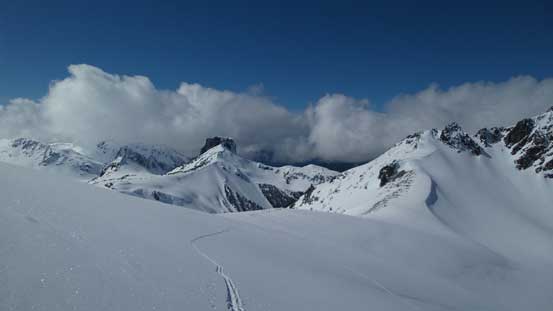 At this point Alex and I had some worry that a high level traverse from Deception’s ridge towards Sphinx Pass (where the route of The Sphinx started) might not go, so to check it out we aimed for a saddle on the ridge at about 200 vertical meters below the summit. Thankfully we were happy about the appearance of the other side. After ditching our entire backpack we resumed the ascent, and a few more switchbacks later we arrived at the summit pinnacles. It was difficult to tell which of the two was the true summit but the left side one appeared more aesthetic (a short, but steep snow climb versus the other one which was a slog up semi-covered boulder fields).