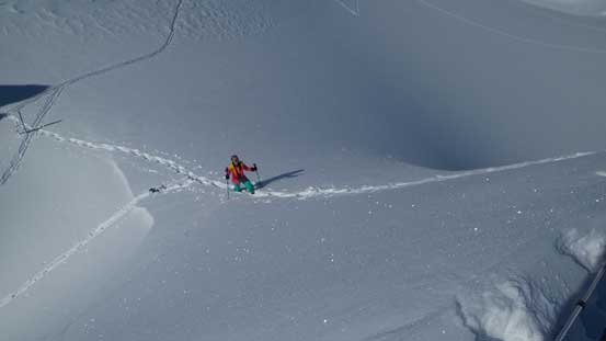 From the summit of the snowy one it was still difficult to judge which of the two being the “true summit”, but we all felt it was good enough nonetheless. After reversing the short snow climb it’s time to ripe off the skins. The run down to where we ditched backpacks was short, but very fun.
