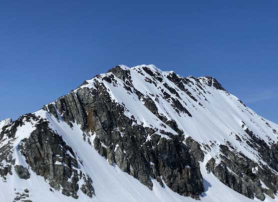We rested for about an hour and then decided to scramble up Eureka Mtn. in the afternoon rather than waiting for the morning. From camp we had to lose a bit of elevation to the base of ridge. We then traversed around to the south-west side and snowshoed up the lower flanks until we ran out of snow. The scrambling on the south ridge was mostly class 2 but a little bit airy in places. We also had to be careful about cornices but the snow had generally melted back enough that staying entirely on rock was not a difficult task. We made to the summit in under 1 hour from camp a. I descended a bit of ways down the NE Ridge to scout things out for future parties. The conclusion was that the NE Ridge from Eureka/Oasis col would also work but there’s some steep and exposed snow near the summit.