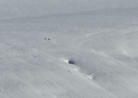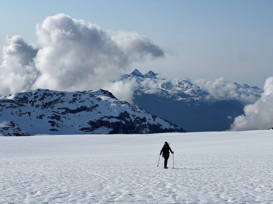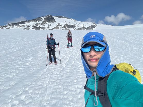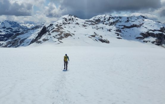Traversing towards “Fringe Peak” was also not that straightforward as we encountered lots of micro-terrain. We generally managed to traverse around those bumps using gulch features but up-and-downs were still unavoidable. On the way in we stayed closer to the ridgeline as the decision was to get to Exodus Peak as quickly as possible. The summit of “Fringe Peak” could be tagged on the return. The descent from “Fringe Peak” to the edge of the Pemberton Icefield involved ~100 m elevation loss and the condition was icy enough that made us donning crampons. We brought crampons only because of contingency purposes but in this particular trip the contingency gear had become critical. The slope was also quite steep getting down to the icefield, that using the snowshoes as “crampons” could not be sufficient. The coolest sighting was actually two bear-like creatures descending the icefield. We unfortunately couldn’t tell what are those as the iPhone’s zooming was simply not good enough.