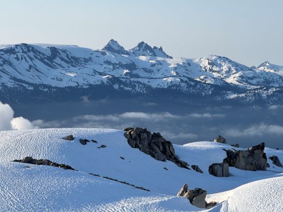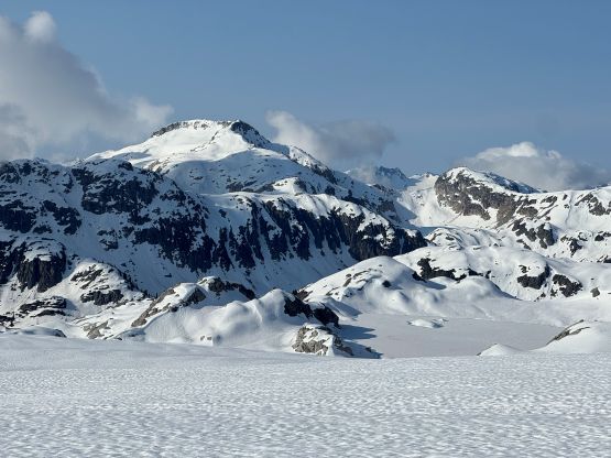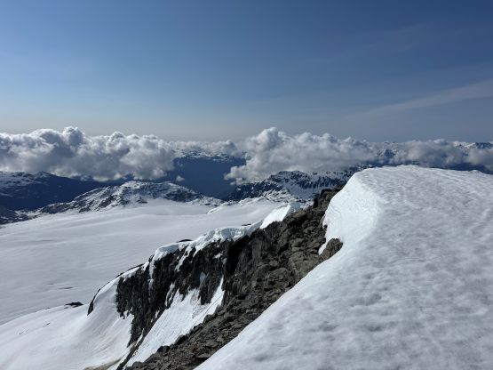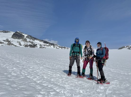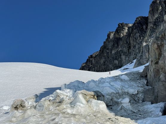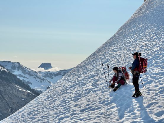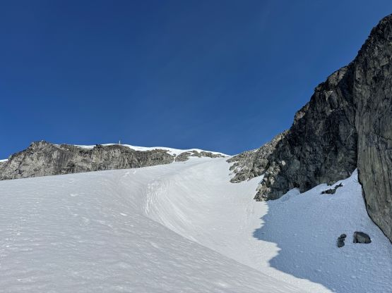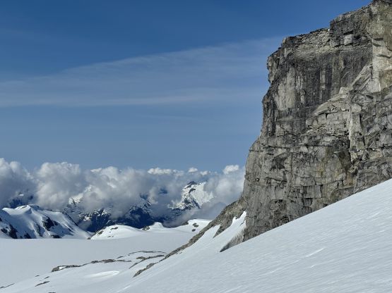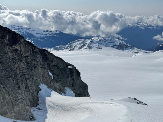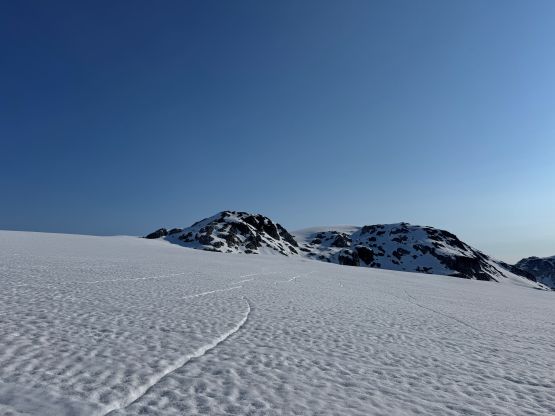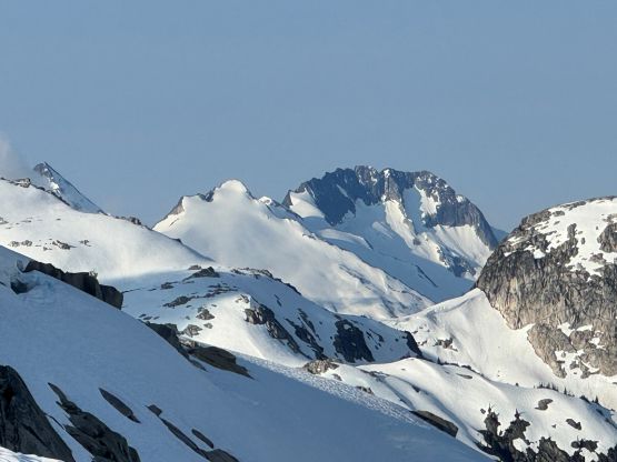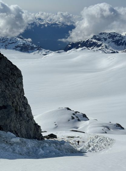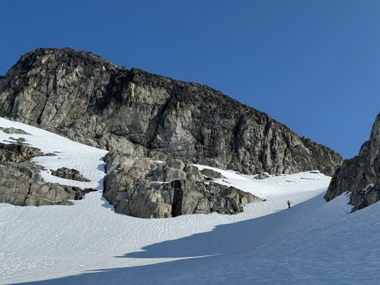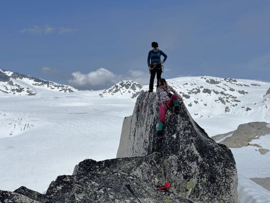 The climb of the SE Face involved over 450 m elevation gain so the descent was also a long one. We had opted to carry the snowshoes given the steep grades, and the snow had softened enough that we all managed to boot-pack/run down the face. The snowshoes were strapped on again for the long slog back across the icefield and also for the steep re-ascent of “Fringe Peak”. None of us was looking forward to actually tag the highest point of “Fringe Peak” but we were too close to give it a pass. I eventually led us across the undulating north ridge. The true summit was actually a monolith and the scrambling involved a few fun 3rd/4th class moves.