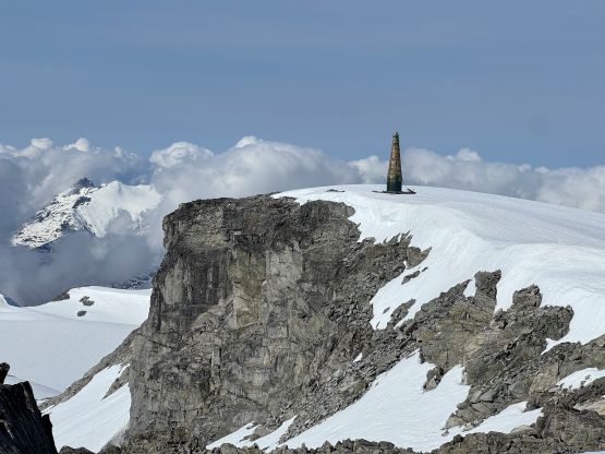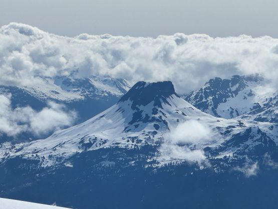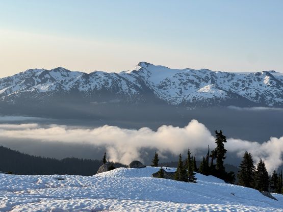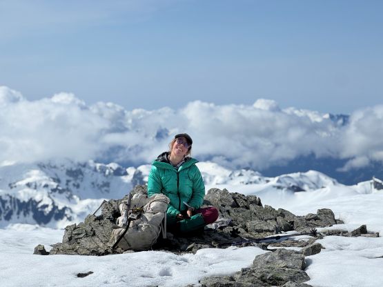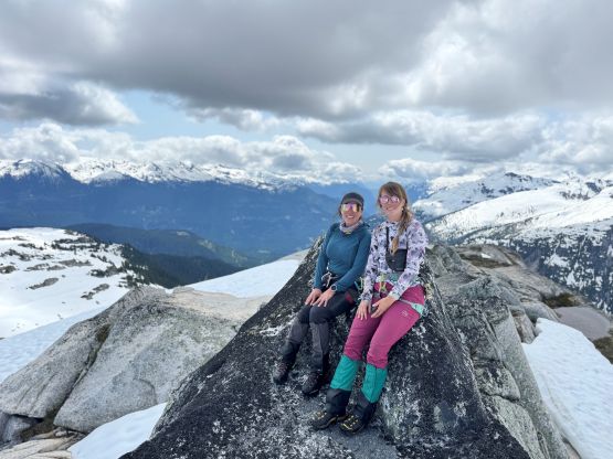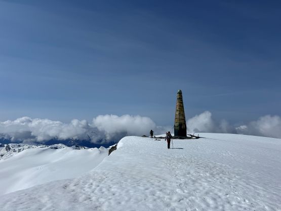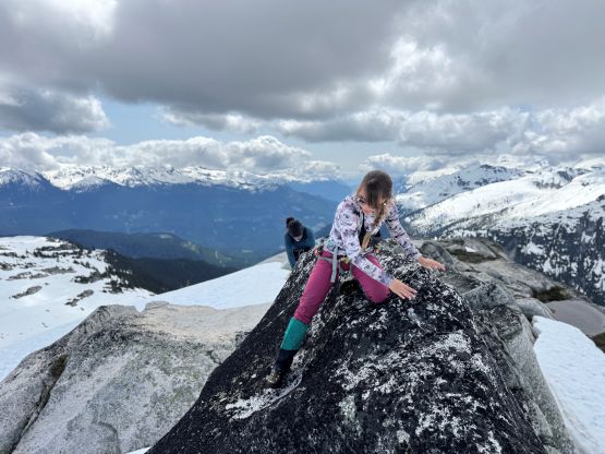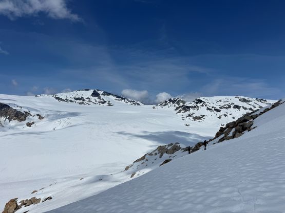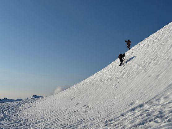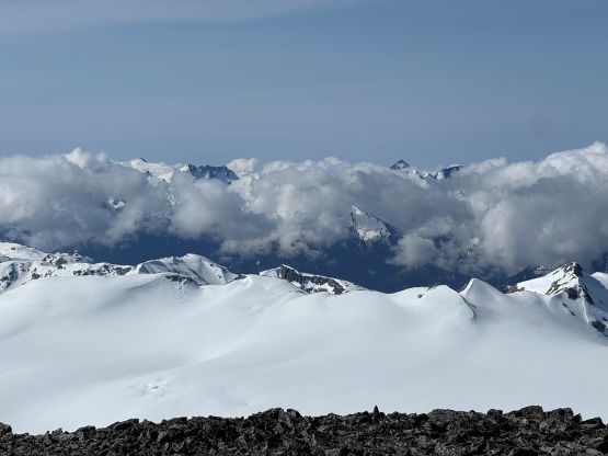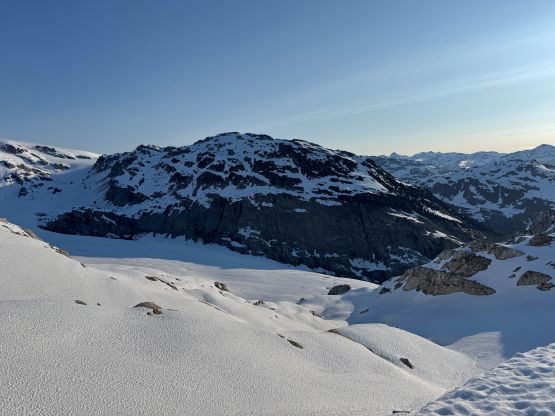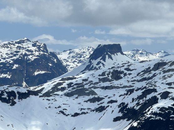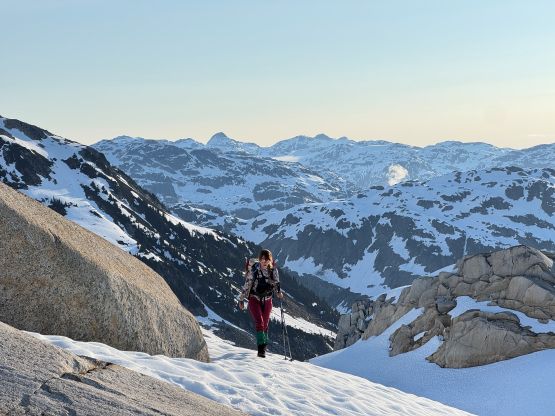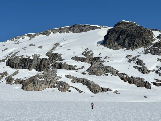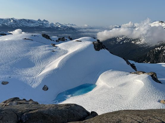 The climb of the SE Face involved over 450 m elevation gain so the descent was also a long one. We had opted to carry the snowshoes given the steep grades, and the snow had softened enough that we all managed to boot-pack/run down the face. The snowshoes were strapped on again for the long slog back across the icefield and also for the steep re-ascent of “Fringe Peak”. None of us was looking forward to actually tag the highest point of “Fringe Peak” but we were too close to give it a pass. I eventually led us across the undulating north ridge. The true summit was actually a monolith and the scrambling involved a few fun 3rd/4th class moves.