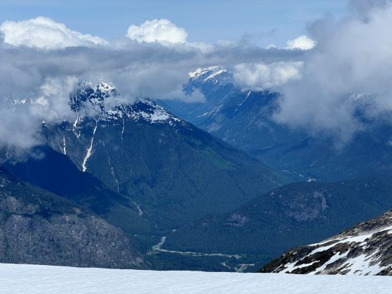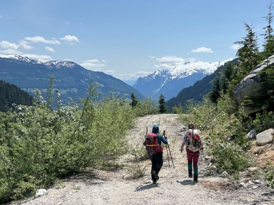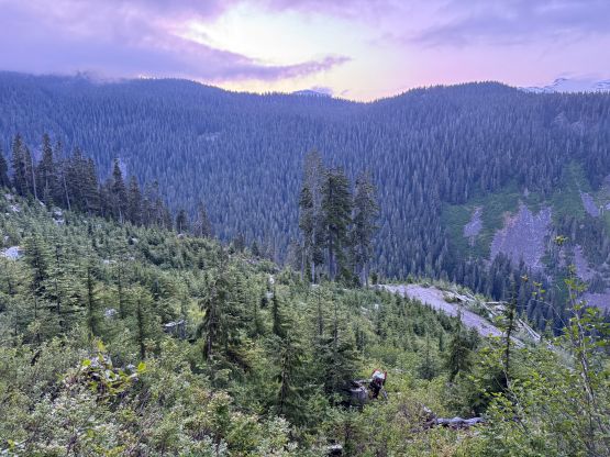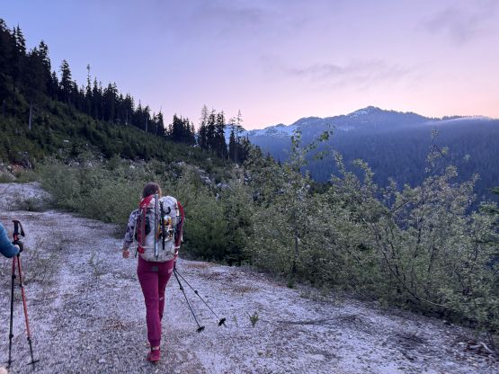 Exodus Peak, one of the major summits on Pemberton Icefield was used to be approached from the west via spur roads off the Elaho Main but there hadn’t been any update in the recent era. A few years ago a “new” access from Carnival Creek to the SE had been published on Facebook. I wanted to take advantage of those roads when they are still in drivable shape. I did my own optimization by drawing a route directly over “Fringe Peak” as I thought this could avoid the nasty bushwhacking that Phil etc. had encountered at the very beginning, but that stayed only in theory. In any case Elise, Miranda and I made the decision to check out the area via my proposed route. I finished work at around 7 pm and the three of us made to Squamish Valley about 2 hours later. The Squamish River FSR was in a terrible shape with a shit ton amount of pot-holes so the driving was slow and tedious. The road conditions actually became better after passing the Elaho Main turn-off. The Carnival Creek FSR was not too bad and the “impasse” that parties had encountered over the past several years had even been fixed. We were able to push the Subaru to literally the drivable end at 950 m elevation and there’s plenty space to turn around, park and set up the tent for car-camping.