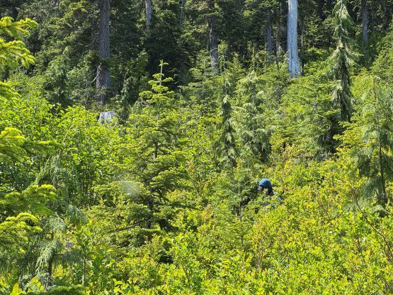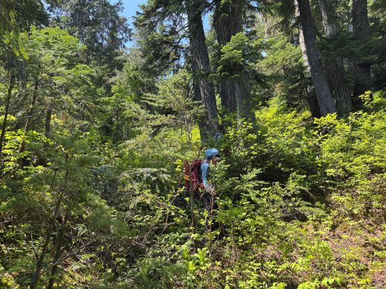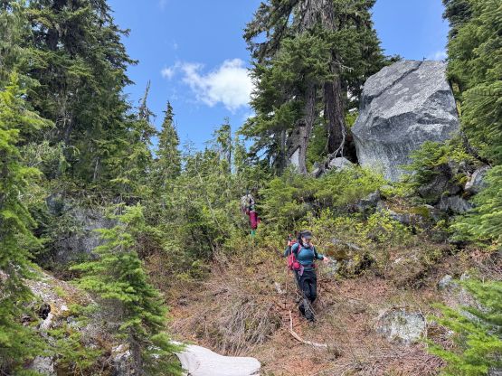 The next morning we all got up at 4 am in order to start walking by 4:30 am. There was already no need to use the head-lamps. It was definitely the right decision to park the Subaru at 950 m elevation because the road beyond that turn-off was completely not drivable even in an ATV. The road was still in a walkable shape. At around 1100 m we dived into the bushes and right off the bat the thrashing was level 3/4 and the bushes were wet. I thought we simply picked the bad line in the cut-block but I honestly don’t think there’s any better way. The situation only improved slightly after entering the forest so the first hour of the trip was downright miserable. There were thankfully, no prickly type of plants. I also had to deal with a lot of route-finding with the micro-terrain and bluffs but I generally managed to pick a reasonable path for us. At around 1450 m elevation we started to encounter patchy snow. The snow definitely helped in reducing the intensity of the bushwhacking but the condition was quite icy given the deep overnight freeze we had the night before, so the trail-runners were quickly swapped for the mountaineering boots. Elise and I had opted to wear the runners as we anticipated a mostly trouble-free plod in the open forest. The forest turned out to be anything but open. The trail-runners had to be carried all the way into the alpine as there wasn’t any obvious spot to ditch them.