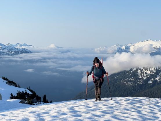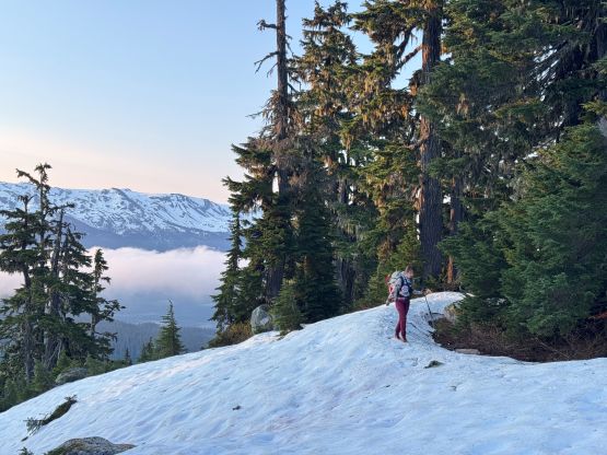 Eventually it was the time to start descending. I initially thought to just walk back across the north ridge but discovered a few deep holes, so strapped the snowshoes on. As soon as the real descending began I took the snowshoes off and enjoyed some fast plunging. We picked a line different than the one we took on the ascent, but tried hard to avoid unnecessary elevation loss/regain. There were some steep side-hilling involved. Eventually we merged back to our own foot prints and followed them down into the forest. The final few hundred meters in the forest involved a great deal of GPS navigation as the micro-terrain was confusing and the bushwhacking was intense. Eventually we hit the road. I spent a few minutes swapping the waterlogged boots to the trail runners, and then jogged down to the vehicle. Our round trip time was 9 hours 15 minutes and that includes the hour-long summit stay, so this wasn’t that enormous day that I was originally anticipating. I’m not sure if the bushwhacking we did was better or worse than Phil’s route but we at least drew a line straight from the road to the summit and back, and I thought that was quite cool. Elise and I took turn driving home that we even got back in time for dinner.