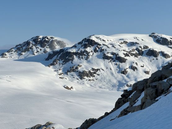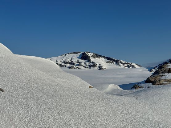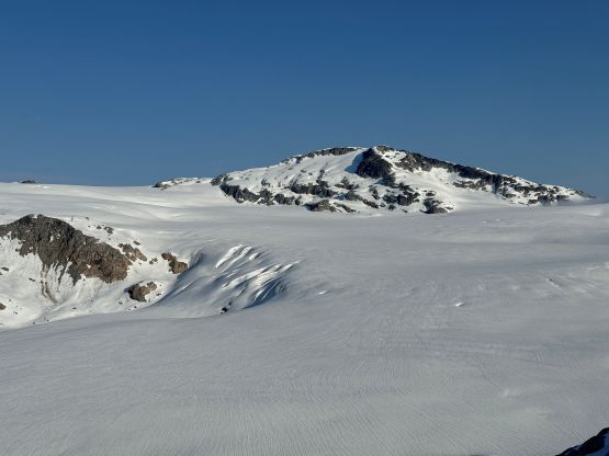 We all donned harness and had brought a rope for the glacier travel but the decision was made to not use the rope given the deep overnight freeze. I did make us donning snowshoes for various reasons. The glacier crossing was extremely long and monotonous, but was quite simple. We did encounter countless amount of cracks but there wasn’t any open crevasse to work our way around. Elise was leading the way and thought we should aim for a direct route up the SE Face of Exodus Peak. Initially I was rejecting the idea but upon closer examination I agreed. This experimental route could save at least 2 km of the distance so why not. Elise led the way picking the route around various ramps and ridges, that we even managed to keep the snowshoes on all the way to the summit. The steepest slope was around 35 degrees and was right underneath the obvious wind scoop on the upper route. There are two summits of similar height. I checked out the NE summit first before settling on the SW summit (with the green dildo) for an hour-long stay. I had brought the stove and fuel canister so we all got some water resupply.