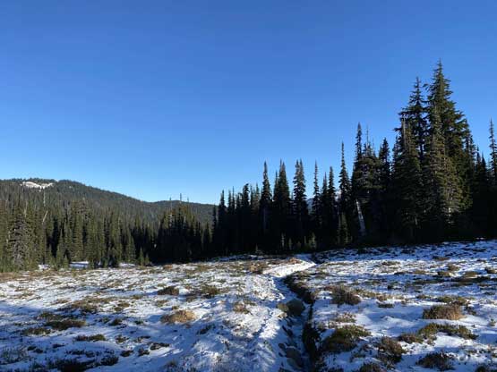 At the parking lot we bumped into a group of four and one of which ended up recognizing Winnie out. I’m starting to get used to be recognized out in the recent years but for Winnie this was probably the first time. For gears we decided to carry snowshoes and aluminum crampons but instead of carrying mountaineering boots while wearing trail-runners I opted to just wear a pair of heavy duty hiking boots. This turned out to be a bit of poor decision as the slopes on Gentian Peak was steep and icy that I would feel more comfortable wearing the Trango Towers with the step-in crampons, but oh well.. Winnie’s very strong on the trails so I wanted to travel as light as possible so that I wouldn’t fall too far behind. Even with the lighter gears I still ended up falling behind on the switchbacks up Helm Creek drainage. We made to a nice viewpoint under the morning sunshine past Helm Campground in exactly 2 hours. I took over the lead for the next while, bailing the trail into the flat drainage heading for the toe of Helm Glacier. The absence of tracks and the requirement of route-finding did help slowing down our pace.