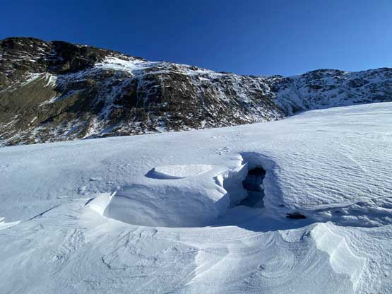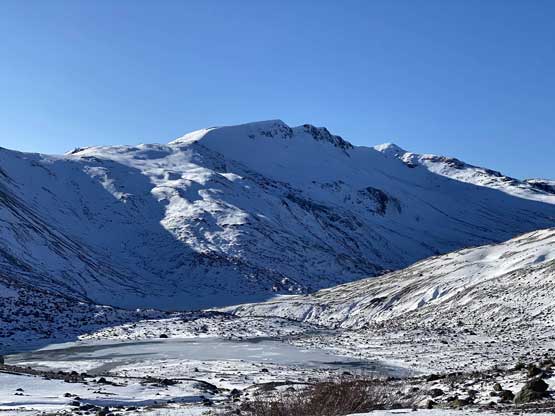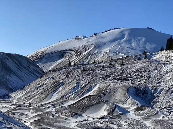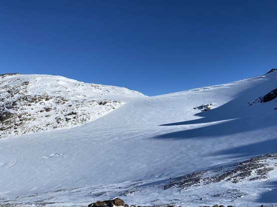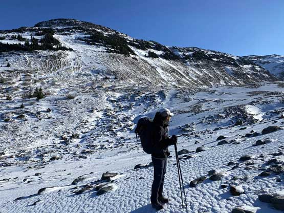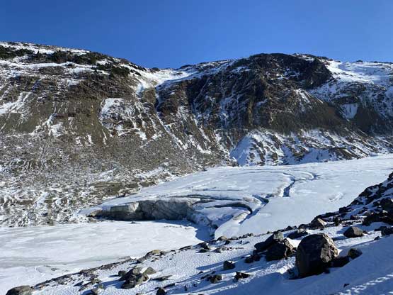 There was some up-and-downs, micro-terrains and boulder hopping to get onto Helm Glacier and with the shallow snow coverage it wasn’t obvious where exactly to aim for. We went for the climber’s right side and had to deal with a steep drop to access the glacier. Once onto the glacier we decided to strap the snowshoes on even though they weren’t really needed. The snow was firm enough that foot penetration would be zero and in fact, we would need crampons had we not been using the snowshoes. We thought about bypassing the glacier by aiming for the col between Panorama Ridge and Gentian Peak but we figured the ascent of this glacier would be more aesthetic and also more fun. We found quite a few partially hidden crevasses as well as a large mine field near the top of the glacier, so contrary to some other documentations this glacier does hold some hazards. The condition was firm enough for us that falling into a crevasse, especially while wearing snowshoes would be very minimal. Upon reaching the top of Helm Glacier we traversed between several large crevasses and aimed for a notch on the NE Ridge. The wind and coldness picked up considerably forcing us to keep moving at a considerable pace without much of stopping.