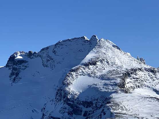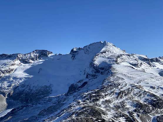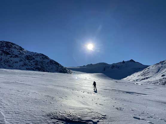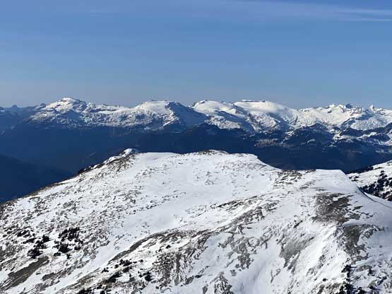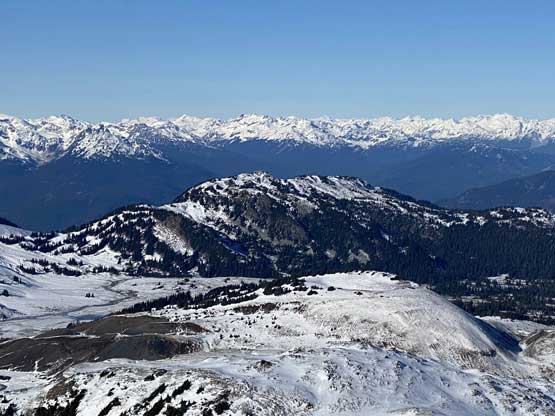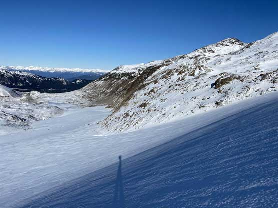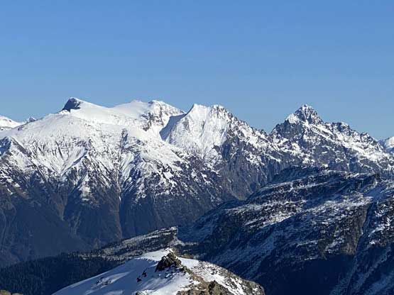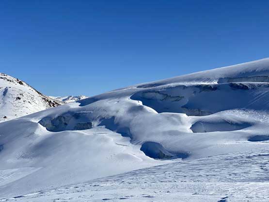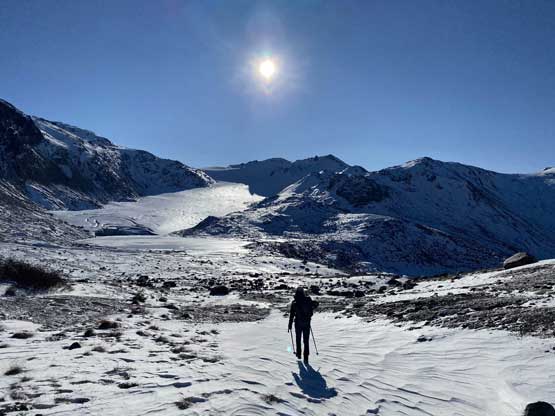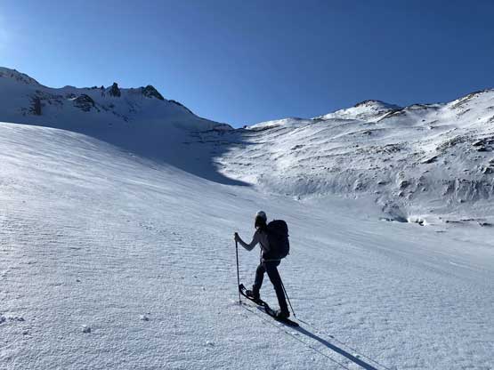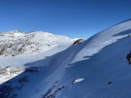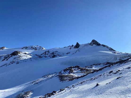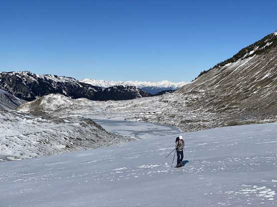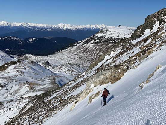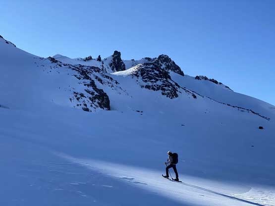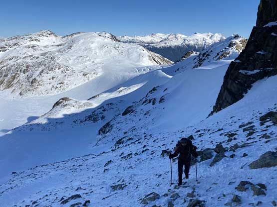 For the whole climb we had been carrying everything including snowshoes so we could just do a traverse by descending the SE Ridge. This would be the shortest option to access Gentian/Panorama col but also involved some steepish snow that I felt a bit sketchy wearing my loose hiking boots and aluminum crampons. I made several large detours to avoid the most exposed patches of the icy snow slopes and did manage to make it work. Lower down we were forced to get onto the glacier again and down-climb a steep roll. Once dropping to the low point we didn’t waste time but carrying on towards Panorama Ridge.