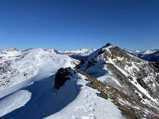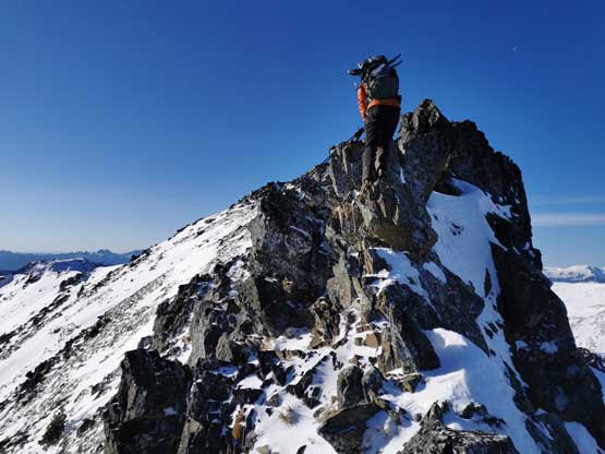 Upon hitting that notch we took the snowshoes off and started scrambling but soon came to a dead end. I wasn’t feeling comfortable soloing the steep ridge especially in this strong wind and also didn’t want to put the aluminum crampons in test on the rocky and icy east-facing slopes, so made a decision to strap the crampons on and climb the snow on the west side. This brought us to a short step of steep traverse (50 degrees ish) with considerable exposure. Without the mountaineering boots I didn’t feel comfortable climbing that neither, so made the call to backtrack losing 100 m elevation down to the glacier and ascend the north face instead. The face looked steep from afar but actually turned out to be very easy. The summit was then shortly reached.