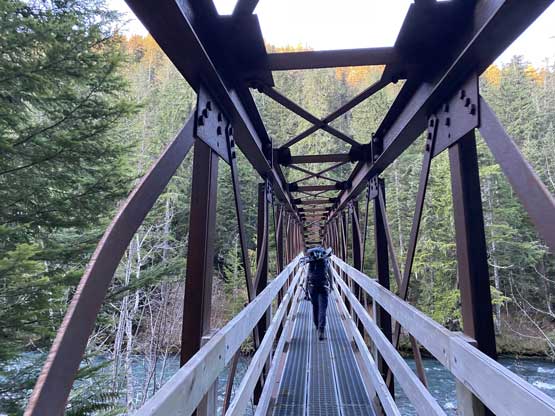 At the parking lot we bumped into a group of four and one of which ended up recognizing Winnie out. I’m starting to get used to be recognized out in the recent years but for Winnie this was probably the first time. For gears we decided to carry snowshoes and aluminum crampons but instead of carrying mountaineering boots while wearing trail-runners I opted to just wear a pair of heavy duty hiking boots. This turned out to be a bit of poor decision as the slopes on Gentian Peak was steep and icy that I would feel more comfortable wearing the Trango Towers with the step-in crampons, but oh well.. Winnie’s very strong on the trails so I wanted to travel as light as possible so that I wouldn’t fall too far behind. Even with the lighter gears I still ended up falling behind on the switchbacks up Helm Creek drainage. We made to a nice viewpoint under the morning sunshine past Helm Campground in exactly 2 hours. I took over the lead for the next while, bailing the trail into the flat drainage heading for the toe of Helm Glacier. The absence of tracks and the requirement of route-finding did help slowing down our pace.
