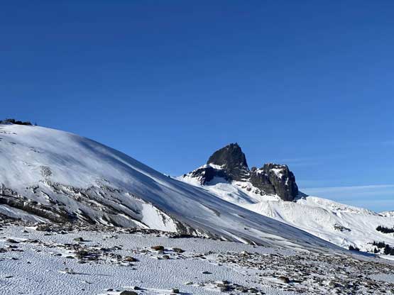 Upon hitting that notch we took the snowshoes off and started scrambling but soon came to a dead end. I wasn’t feeling comfortable soloing the steep ridge especially in this strong wind and also didn’t want to put the aluminum crampons in test on the rocky and icy east-facing slopes, so made a decision to strap the crampons on and climb the snow on the west side. This brought us to a short step of steep traverse (50 degrees ish) with considerable exposure. Without the mountaineering boots I didn’t feel comfortable climbing that neither, so made the call to backtrack losing 100 m elevation down to the glacier and ascend the north face instead. The face looked steep from afar but actually turned out to be very easy. The summit was then shortly reached.