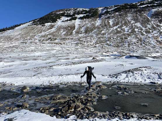 There was some up-and-downs, micro-terrains and boulder hopping to get onto Helm Glacier and with the shallow snow coverage it wasn’t obvious where exactly to aim for. We went for the climber’s right side and had to deal with a steep drop to access the glacier. Once onto the glacier we decided to strap the snowshoes on even though they weren’t really needed. The snow was firm enough that foot penetration would be zero and in fact, we would need crampons had we not been using the snowshoes. We thought about bypassing the glacier by aiming for the col between Panorama Ridge and Gentian Peak but we figured the ascent of this glacier would be more aesthetic and also more fun. We found quite a few partially hidden crevasses as well as a large mine field near the top of the glacier, so contrary to some other documentations this glacier does hold some hazards. The condition was firm enough for us that falling into a crevasse, especially while wearing snowshoes would be very minimal. Upon reaching the top of Helm Glacier we traversed between several large crevasses and aimed for a notch on the NE Ridge. The wind and coldness picked up considerably forcing us to keep moving at a considerable pace without much of stopping.