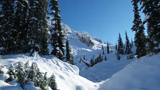 From camp it appeared to be nothing more than a few hours’ plod via the obvious gully although I was expecting fair amount of post-holing. The snowpack also didn’t appear to be thick enough to cover the boulder fields. I initially ascended the connecting ridge on the climber’s right side (Hanging Lake side), and once there’s enough snow to at least partially cover the boulders I moved into the gully and grinded my way to what appeared like a high col. It turned out to be a large plateau area with the true summit on my left.