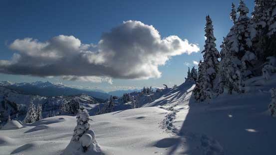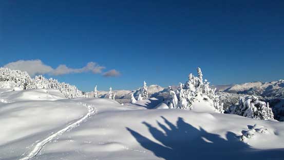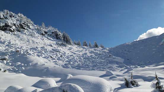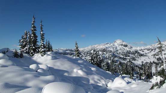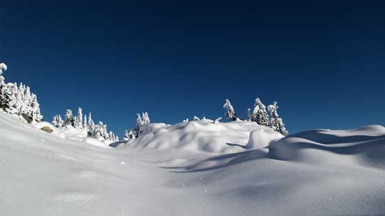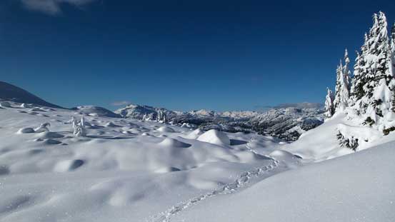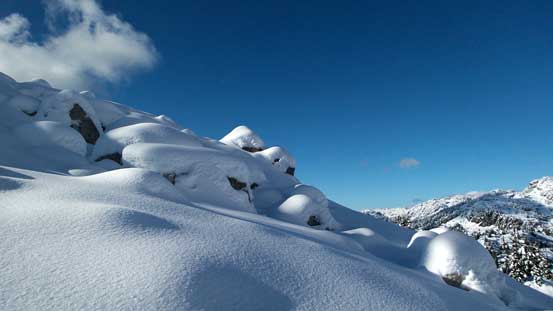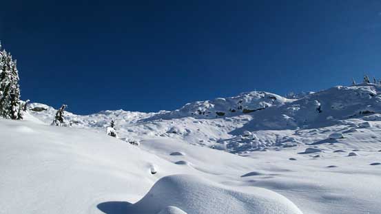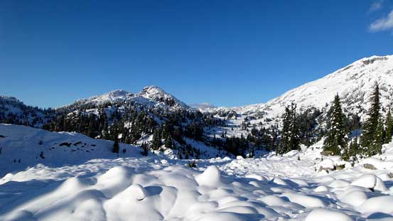 Coming down the summit block I just plunged/slid down a steeper line and it worked out nicely. I thought about exploring the plateau area for a bit but decided against it knowing I still had a long way to go as I wasn’t planning on staying another night. Retracing my tracks went fast and furious and I was back in camp in no time.