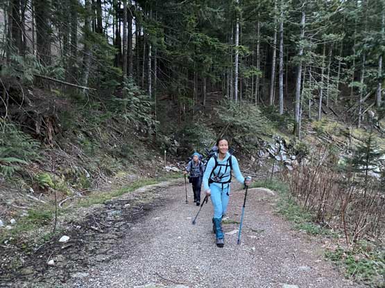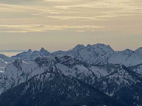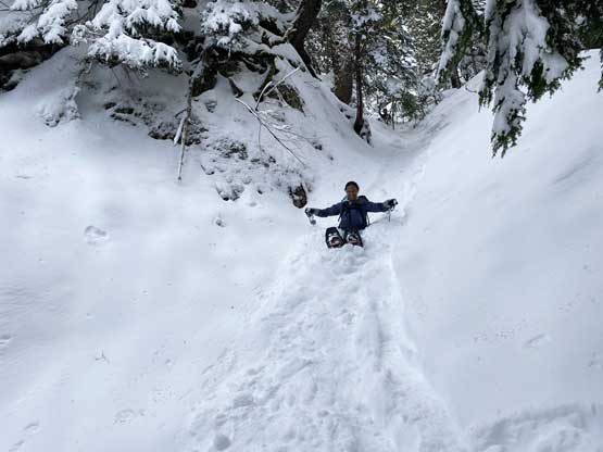 The summit was a bit windy and cold so we didn’t linger too long. While descending the upper ridge the high clouds finally moved away giving some superb views. Mel and Winnie had set a blistering pace to descend so whenever I snapped a few photos I had to run to keep up. I still managed to take a shit ton of photos since the view was the reason why I came up here. There was no break once we descended back into the forest. The deep powder in treeline zone was uber fun to plunge and glide down but soon we came to that steep and icy stretch near 1200 m. Mel and Winnie did a few butt slide to clean the zone out in style. For the sketchiest section I did not feel comfortable glissading with snowshoes on and without an ice axe, so gingerly took the snowshoes off and down-climbed facing into the slope. We then raced down the next 500 or so vertical meters. I was struggling to keep up the pace probably because of my cumbersome 30′ snowshoes. Both Mel and Winnie had 22′ shoes. Once the snowshoes were off I took over the lead racing down the snow-covered-trail back to the logging road stretch. At this point Mel set our goal to finish the descent without having to use head-lamps. I was not keen but reluctantly agreed.