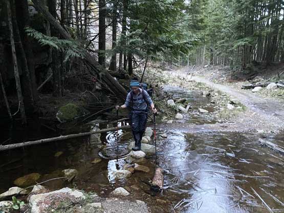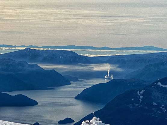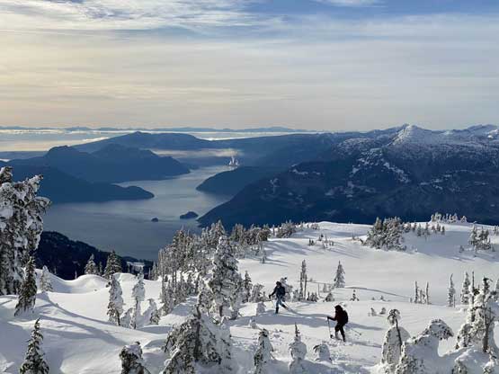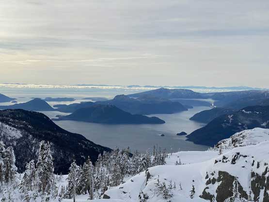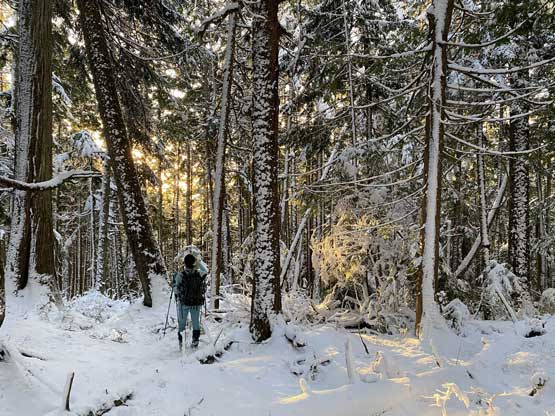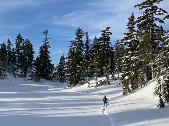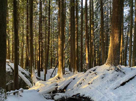 I had been wanting to snowshoe this route for a couple years and finally made the spontaneous plan with Mel and Winnie on the second day of this Christmas break weather window. On the first day I just did some dumpster-diving on Galiano Island. There wasn’t a lot of walking, but fair amount of waiting and driving making a decently tiring day. The three of us agreed to meet at Murrin Park at 7:30 am. The drive was short enough that we decided to not carpool thank to the stupid Covid. We started the plod with head-lamps on for about 20 minutes. The trail-head is on the east side of the highway so we had to run across the road at the start. We then followed the Gaia map to correctly locate the trail-head. The first stretch of the trail had a few rocky and slippery steps. A few hundred vertical meters of gain later we merged out of the mature forest onto what seemed like an old logging road and followed this road for a few kilometers up. At about 550 m elevation the trail left the road into the forest again and the snow soon became continuous, but the snowshoes stayed on our packs until 900 m elevation, past Petgill Lake junction.