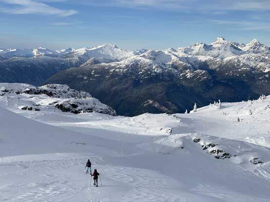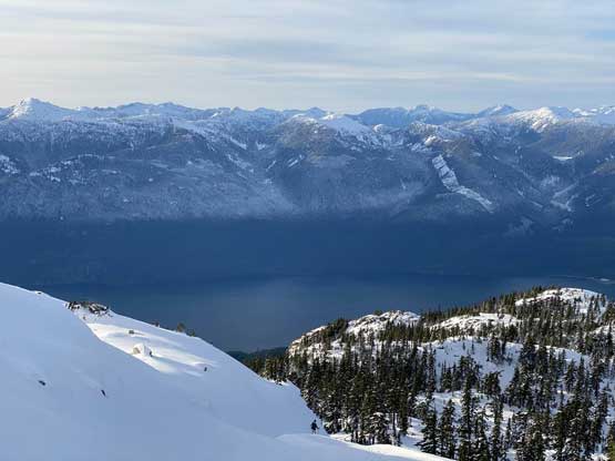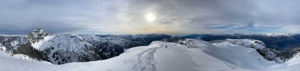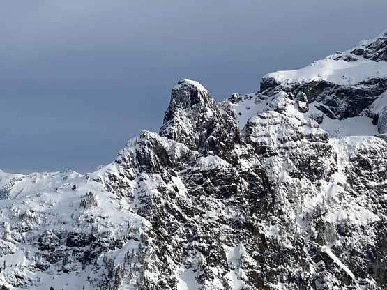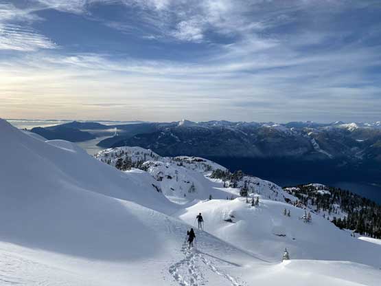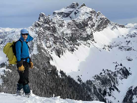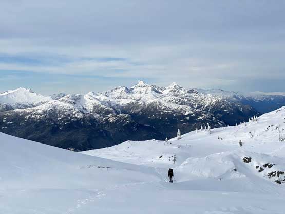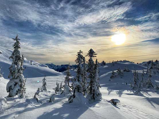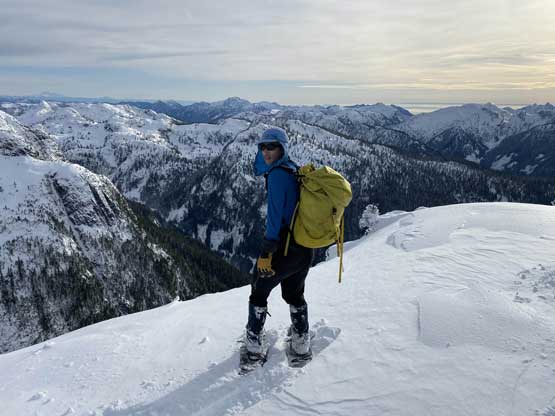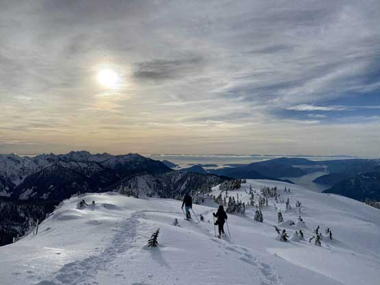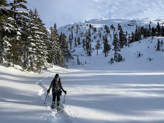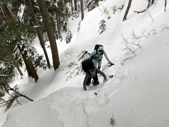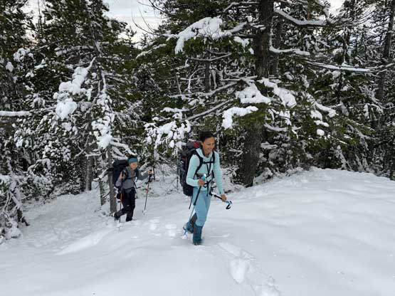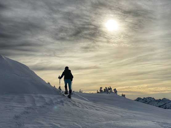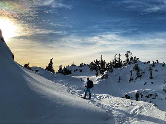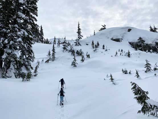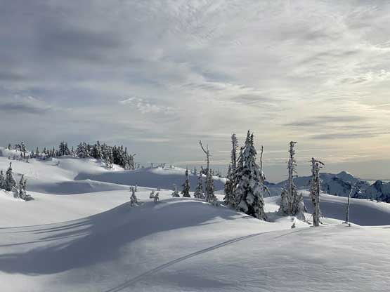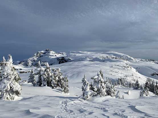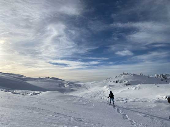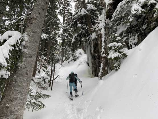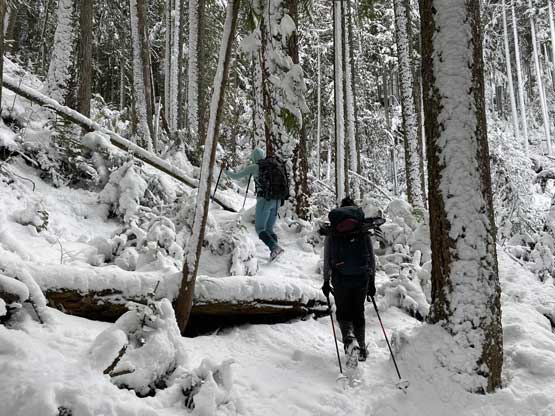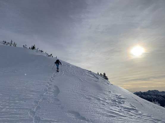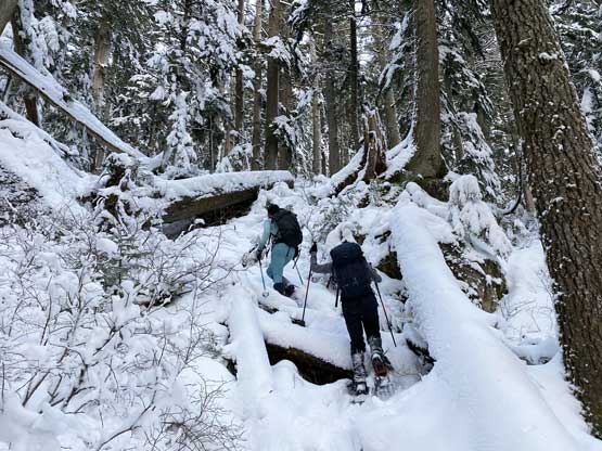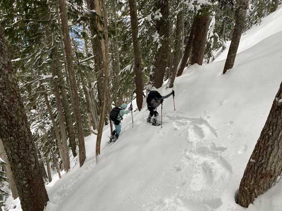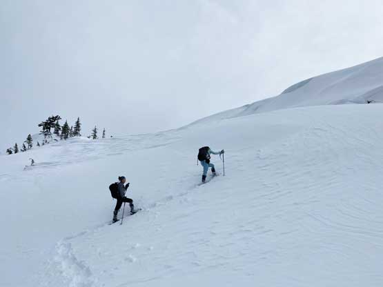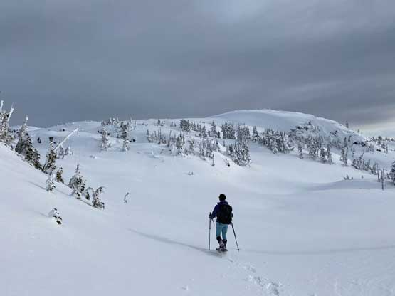 The trail was confusing and difficult to follow but there were enough orange markers and flagging that we were able to stay mostly on track. The trail was also difficult to hike on as the snow was deep enough to warrant the use of snowshoes, but not quite deep enough to comfortably snowshoe on, and the terrain was steep. The steepest stretch was around 1200 m where we had to ascend some 40 degree forest through bluffs. The snowpack was finally deep enough but the grade was almost too steep for our snowshoes. There’s only about 15 cm of fresh powder on top of a very firm base layer, which made some dedicated “technical snowshoeing” moves with some exposure. Beyond this technical stretch the slope grade eased but the trail-breaking took over. For about an hour we sank past knee deep on the uphill side making some tedious and slow progress. We did power it through and at around treeline we transitioned onto some wind-affected terrain and the trail-breaking finally eased.