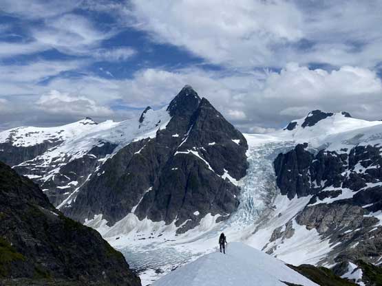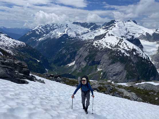 At this point we had some discussions. I had two separate weather updates. One from Winnie/Mel and the other from Lily both saying 2-3 days of rain coming up soon. The laziest option was to wait it out here at a comfortable location but we all wanted to keep moving taking advantage of as much as “good weather” as possible. The degree of uncertainty was too high for us to kill time at the pass, so we carried on to ascend Mt. George Edwards in the evening and then Mt. Tinniswood the next morning.
