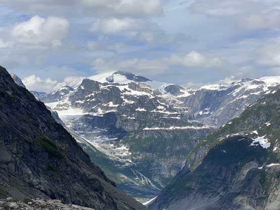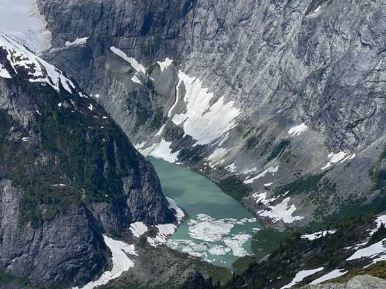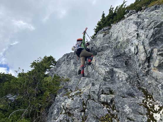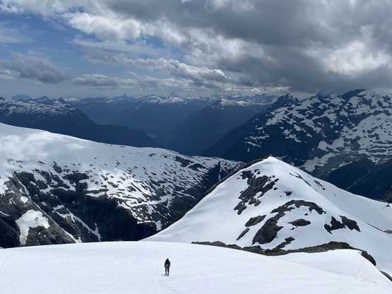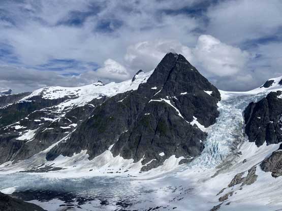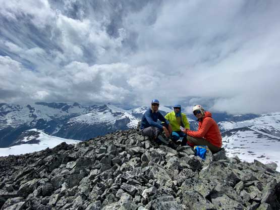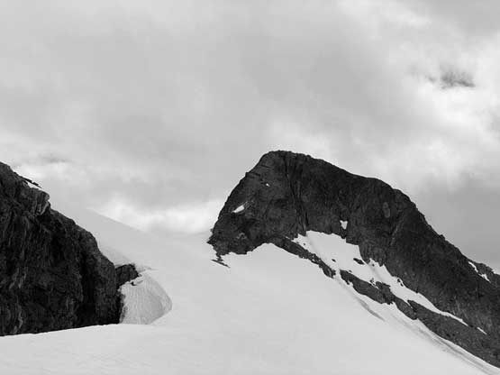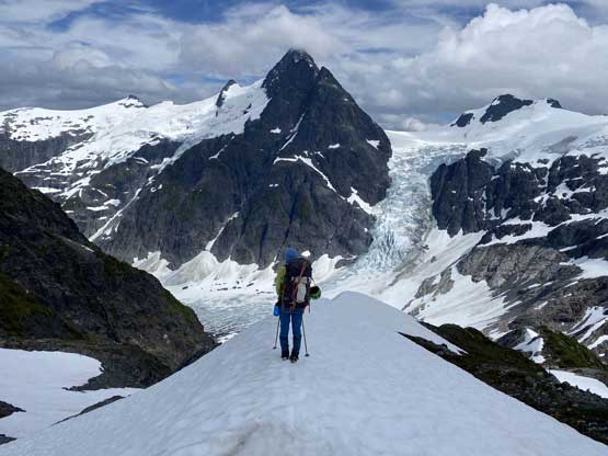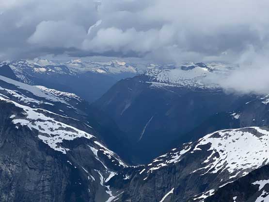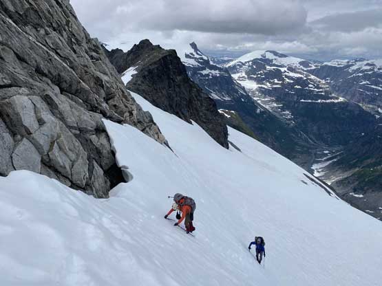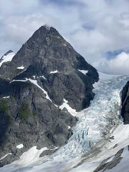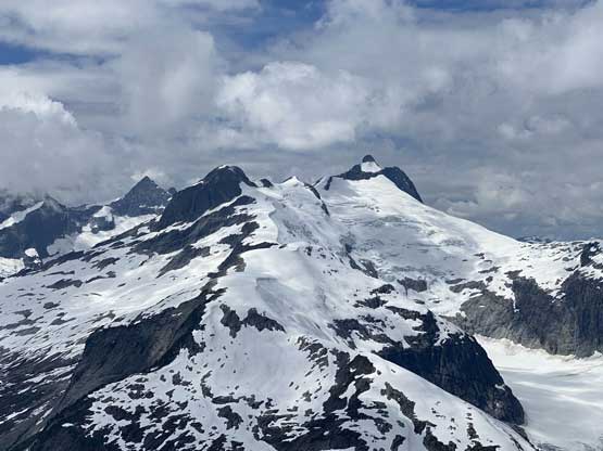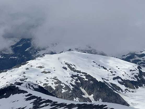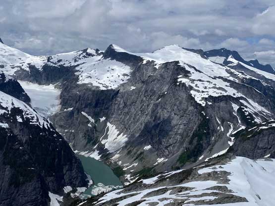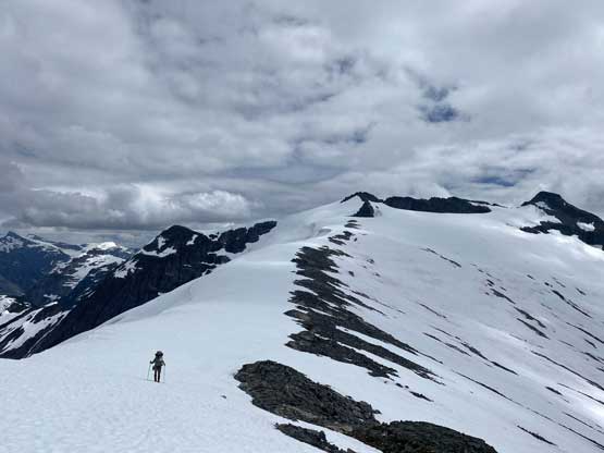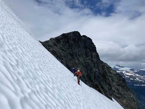 We did not come prepared for the difficulties of climbing the summit block and the north side appeared vertical from afar, but we did have studied the Google satellite images. The plan was to traverse over the col immediately north of the summit block, then traverse across the steep east face to a notch on the south side of the summit. The ascent onto the broad NW ridge from Blumlisalp/Hammerstein col involved a few scrambling steps of steep heather or snow with excellent views into Hunaechin Creek valley. Once gaining the NW ridge we had a long plod up what seemed like a never-ending snow ridge/ramp to the col north of the summit block. The north ridge did not look like “scrambling” so we had to resume our plan, traversing over to the south side hoping for a route form the opposite direction.