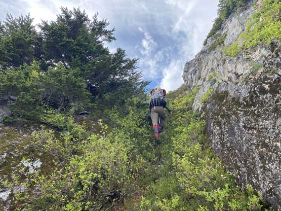 Once having enough photos we carefully made our way back to the backpacks and continued descending southwards aiming for the very aptly-named “Inaccessible Pass” somewhat 600 m below us in Hammerstein/George Edwards chasm. The initial couple hundred meters of descent was easy on mostly snow but soon we had to face some narrow sections of ridge and rock steps. The crux came about 2/3 of the way down when we faced a steep and bushy drop. We tried a couple routes that all would require rappels through steep bush. I almost convinced us to rappel but Vlad had more experience in this type of terrain and managed to find a hidden ramp and gully that went at “class 4 bush”. It was not very pleasant to thrash and lower ourselves down on the moss and branches but it worked. Then we had a couple more interesting steps but none imposed much of a problem, that in a while we were down at “Inaccessible Pass”.