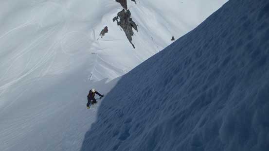 After a few obligatory pictures we had to focus on getting off this mountain. I was pretty worried about a few sections of it to be honest, but let’s focus on one step at a time. The first few steps getting back into the upper face was super sketchy. The snow was a bit loose, the steps were huge (long reach required for descent) and the exposure was severe, but after getting into the “mode” the rest of the upper face’s down-climb was not bad at all following our steps. Now time to traverse, and again, those steps made our lives much easier than anticipated and in short time we were back to that 60-degree section. Some great care was required to deal with a few more long-reaches but soon enough, it was over and we were back to the crux rock steps. And again, a few stemming moves and long-reaches solved the problem, and the rest of the descent down the lower north ridge was fast and fun.